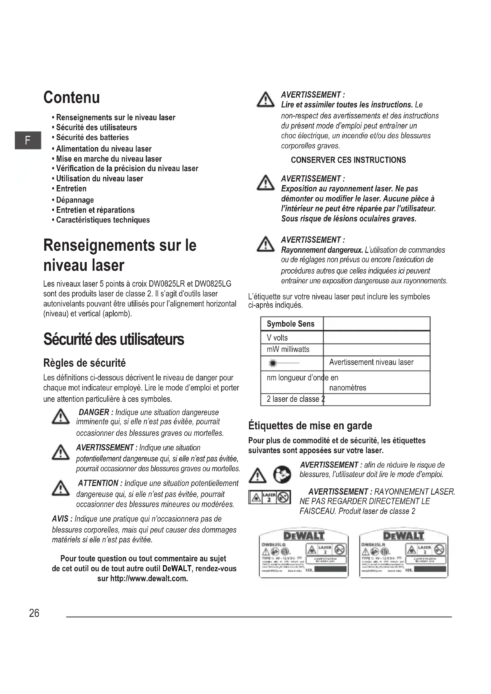 - Caractéristiques techniques Renseignements sur le niveau laser Les niveaux laser 5 points à croix DW0825LR et DW0825LG sont des produits laser de classe 2. Il s’agit d’outils laser autonivelants pouvant être utilisés pour l’alignement horizontal (niveau) et vertical (aplomb). Sécurité des utilisateurs Règles de sécurité Les dénitions ci-dessous décrivent le niveau de danger pour chaque mot indicateur employé. Lire le mode d’emploi et porter une attention particulière à ces symboles.
