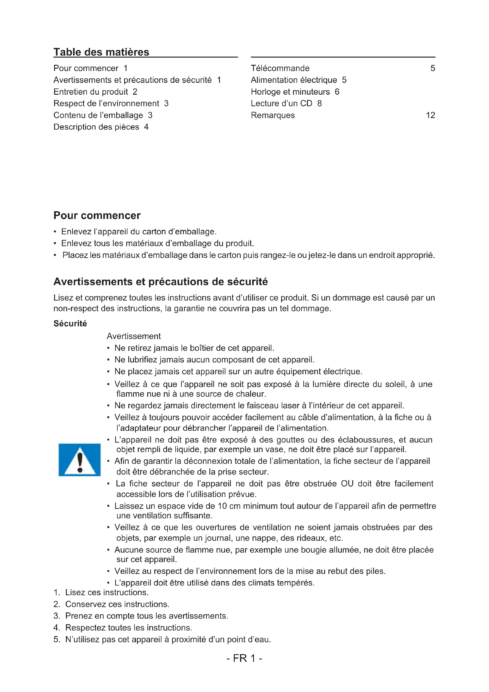 Pour commencer 1 Avertissements et précautions de sécurité 1 Entretien du produit 2 Respect de l’environnement 3 Contenu de l’emballage 3 Description des pièces 4 Télécommande 5 Alimentation électrique 5 Horloge et minuteurs 6 Lecture d’un CD 8 Remarques : 12