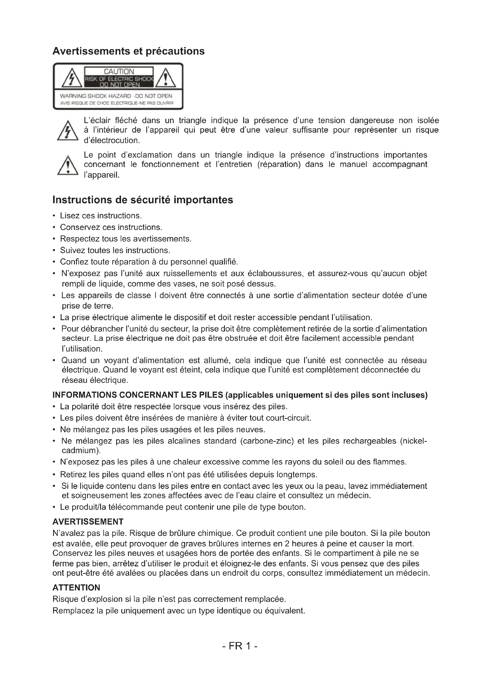 D’UTILISATION AVANT D’UTILISER L’APPAREIL, ET LES CONSERVER POUR VOUS Y RÉFÉRER ULTÉRIEUREMENT. FR- FR 1 - Avertissements et précautions L’éclair éché dans un triangle indique la présence d’une tension dangereuse non isolée à l’intérieur de l’appareil qui peut être d’une valeur sufsante pour représenter un risque d’électrocution. Le point d’exclamation dans un triangle indique la présence d’instructions importantes concernant le fonctionnement et l’entretien (réparation) dans le manuel accompagnant l’appareil. Instructions de sécurité importantes