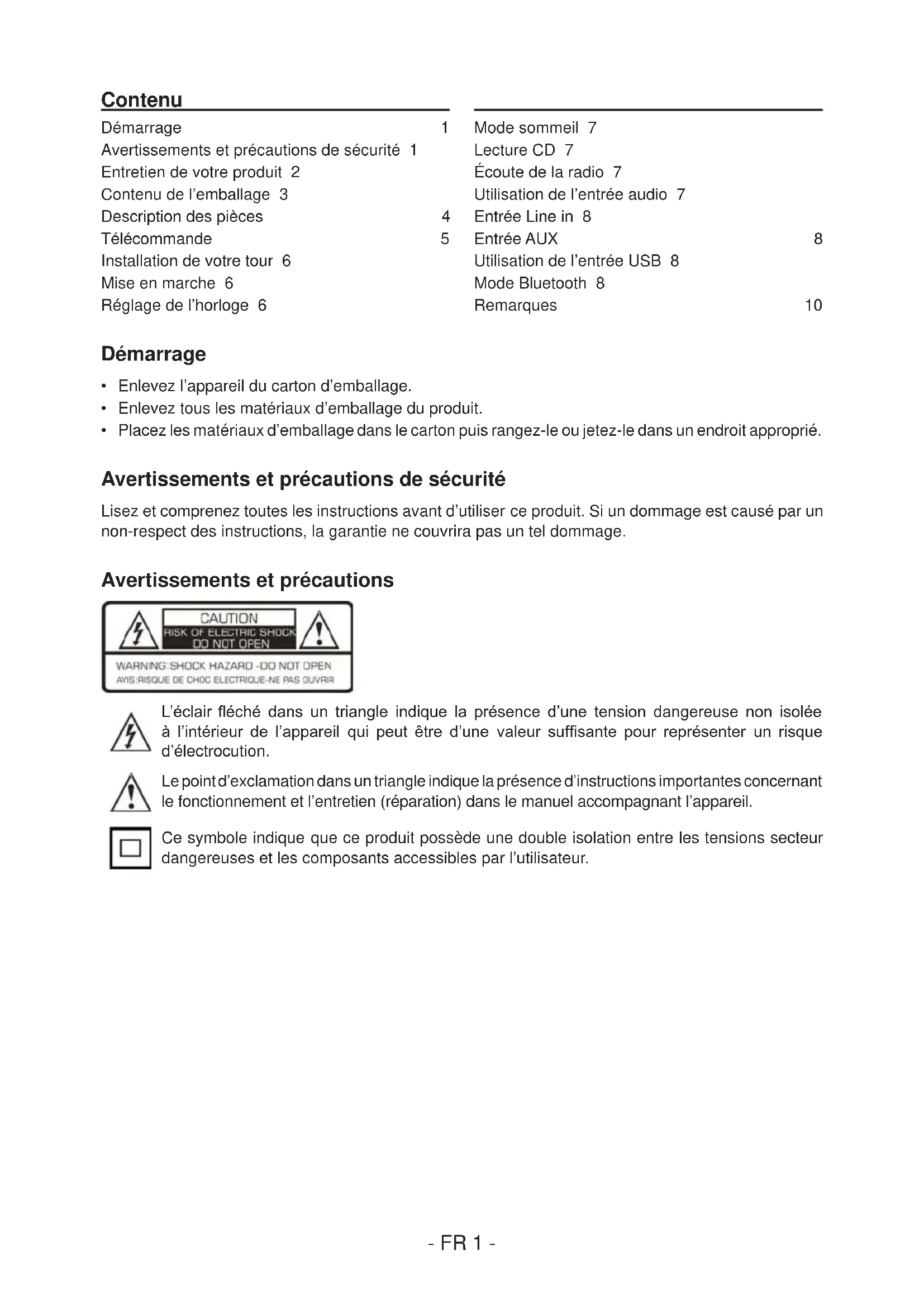 vertissements et précautions L’éclair éché dans un triangle indique la présence d’une tension dangereuse non isolée à l’intérieur de l’appareil qui peut être d’une valeur sufsante pour représenter un risque d’électrocution. Le point d’exclamation dans un triangle indique la présence d’instructions importantes concernant le fonctionnement et l’entretien (réparation) dans le manuel accompagnant l’appareil. Ce symbole indique que ce produit possède une double isolation entre les tensions secteur dangereuses et les composants accessibles par l’utilisateur.- FR 2 - Instructions de sécurité importantes