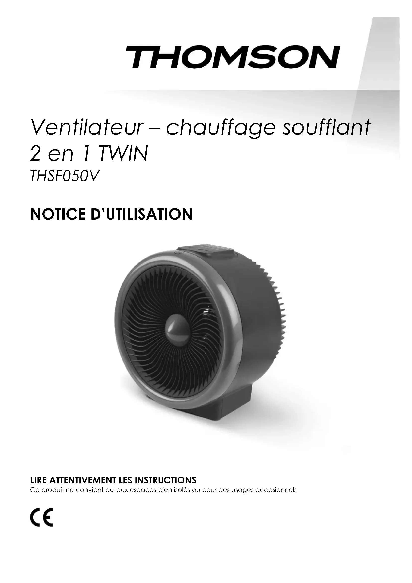 Modèle N° : THSF050V Mode chauffage Puissance Désignation : Ventilateur - Chauffage soufflant 2 en 1 TWIN Chauffage puissance faible 1200 W Tension : 220-240V~ 50Hz Chauffage puissance forte 2000 W