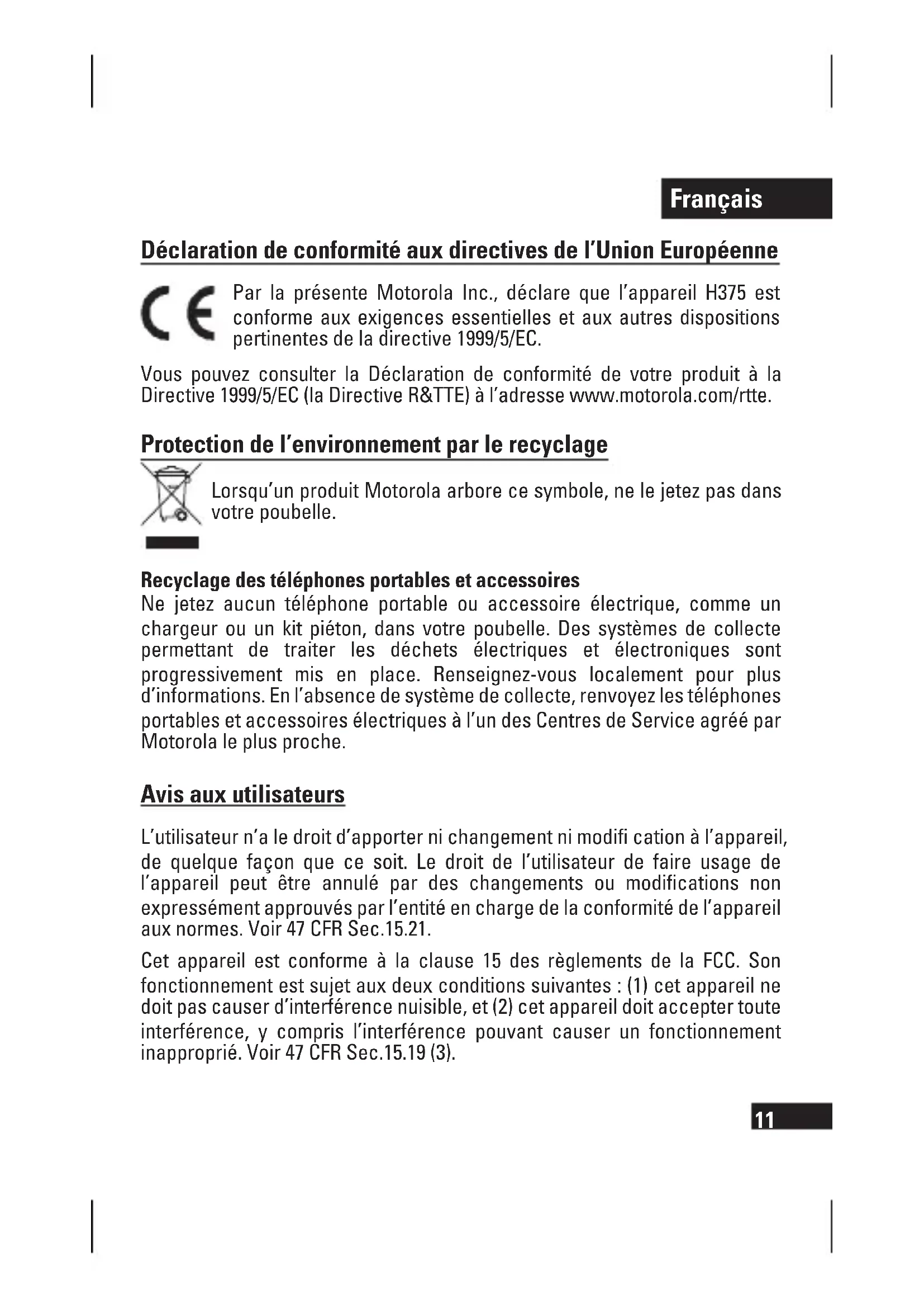 Déclaration de conformité aux directives de l’Union Européenne Par la présente Motorola Inc., déclare que l’appareil H375 est conforme aux exigences essentielles et aux autres dispositions pertinentes de la directive 1999/5/EC. Vous pouvez consulter la Déclaration de conformité de votre produit à la Directive 1999/5/EC (la Directive R&TTE) à l’adresse www.motorola.com/rtte. Protection de l’environnement par le recyclage Lorsqu’un produit Motorola arbore ce symbole, ne le jetez pas dans votre poubelle. Recyclage des téléphones portables et accessoires Ne jetez aucun téléphone portable ou accessoire électrique, comme un chargeur ou un kit piéton, dans votre poubelle. Des systèmes de collecte permettant de traiter les déchets électriques et électroniques sont progressivement mis en place. Renseignez-vous localement pour plus d’informations. En l’absence de système de collecte, renvoyez les téléphones portables et accessoires électriques à l’un des Centres de Service agréé par Motorola le plus proche. Avis aux utilisateurs L’utilisateur n’a le droit d’apporter ni changement ni modifi cation à l’appareil, de quelque façon que ce soit. Le droit de l’utilisateur de faire usage de l’appareil peut être annulé par des changements ou modifi cations non expressément approuvés par l’entité en charge de la conformité de l’appareil aux normes. Voir 47 CFR Sec.15.21. Cet appareil est conforme à la clause 15 des règlements de la FCC. Son fonctionnement est sujet aux deux conditions suivantes : (1) cet appareil ne doit pas causer d’interférence nuisible, et (2) cet appareil doit accepter toute interférence, y compris l’interférence pouvant causer un fonctionnement inapproprié. Voir 47 CFR Sec.15.19 (3).Français