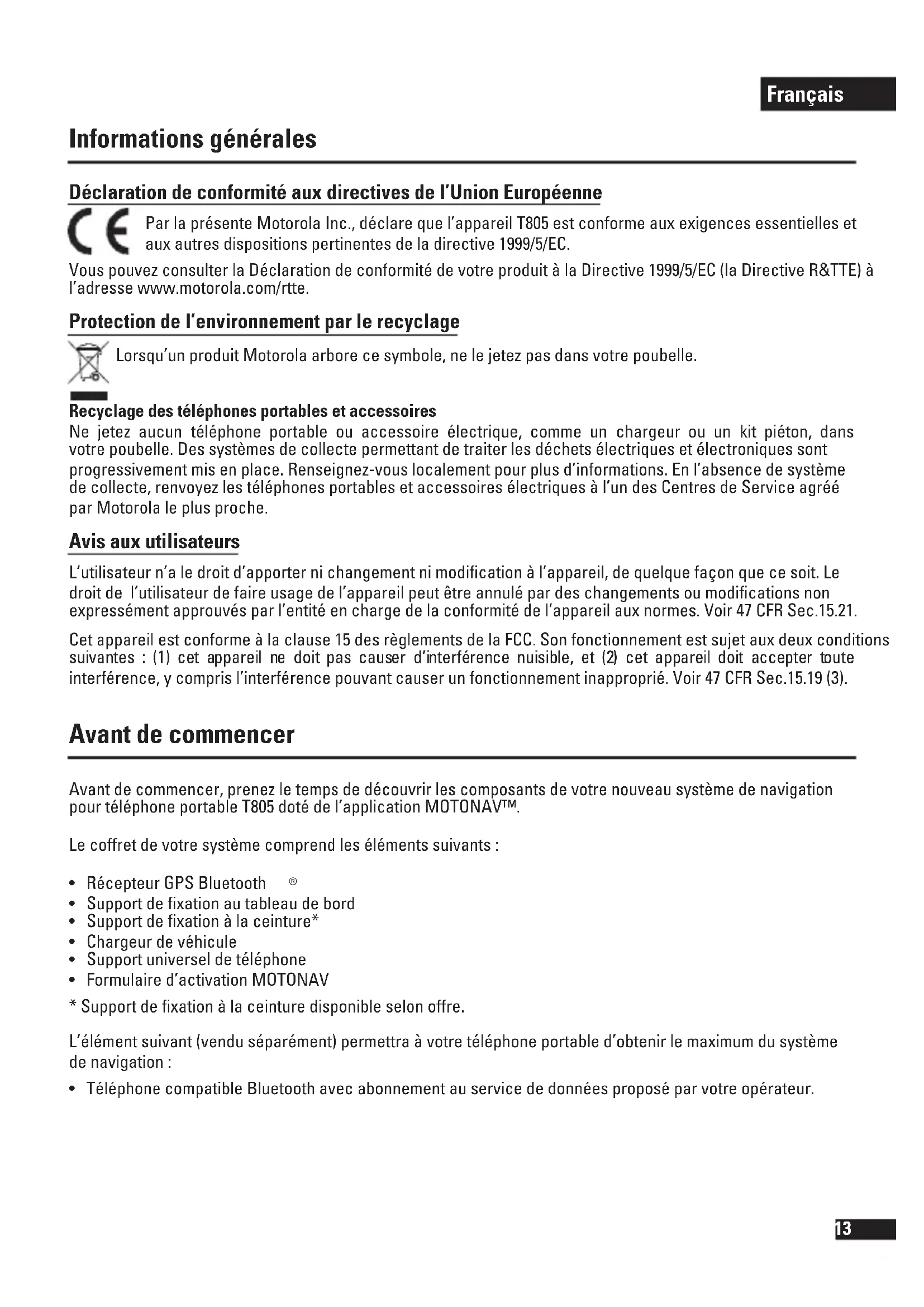- Ouvrez le site Web MOTONAV (www.hellomoto.com/motonav) pour saisir les emplacements et gérer votre compte MOTONAV. Utilisez votre nom d’utilisateur et mot de passe (comme indiqué dans l’étape 4 de la rubrique « Installation de l’application MOTONAV »). Certains téléphones permettent les alertes aux radars fixes. Pour obtenir ces avertissements tout en conduisant, sélectionnez Accompagnateur sur MOTONAV et un signal vous sera transmis à l’approche d’un radar. Disponible que dans certains pays seulement. Utilisation de votre récepteur GPS Marche/Arrêt Pour mettre votre récepteur GPS en marche, appuyez de manière prolongée sur le bouton de mise en marche jusqu’à ce que le témoin d’état de la batterie s’éclaire. Une fois en marche, les trois témoins s’allument l’un après l’autre. Pour arrêter votre récepteur GPS, appuyez de manière prolongée sur le bouton de mise en marche jusqu’à ce que les trois témoins s’allument. Une fois arrêté, les trois témoins s’éteignent l’un après l’autre, puis le récepteur GPS s’éteint. Charge Voir figure 3, page 2. 1 Ouvrez le clapet recouvrant le connecteur de charge. Branchez le chargeur de véhicule Motorola dans le connecteur de charge. 2 Le témoin rouge ou orange s’allume quand la batterie est en charge. Si la charge de la batterie est très faible, le témoin peut prendre un moment avant de s’allumer. Quand la batterie du récepteur GPS est complètement chargée (environ 4 heures), le témoin vert s’allume. 3 Débranchez le chargeur (laisser le chargeur branché pendant une longue période peut réduire la durée de vie de la batterie). Remarque : le récepteur GPS fonctionne normalement pendant le chargement ; cependant le témoin d’état de la batterie n’indiquera pas la charge complète (vert) quand il est en marche. Français22 Témoins lumineux Témoin d’état de la batterie Témoin État Rouge (clignotement) Charge très faible Rouge (allumé en permanence) Charge (inférieure à 10%) Orange Charge (supérieure à 10%) Vert Batterie chargée Témoin GPS Témoin État orange (clignotement) Pas de signal GPS orange (allumé en permanence) GPS détecté Témoin Bluetooth Témoin État Bleu (clignotement) Non connecté au téléphone Bleu (allumé en permanence) Connecté au téléphone Remarque : quand un signal GPS est détecté et la liaison Bluetooth est établie, les témoins BLuetooth et GPS s’éteignent après 10 secondes pour conserver l’alimentation et éviter les distractions. Pour plus d’informations, appelez l’assistance Motorola au numéro suivant :0825 303 302 (0.15 €/minute) ou consultez notre site à l’adresse suivante : www.motorola.com. Français23 Sicherheitshinweise EU-Richtlinien Konformitätserklärung Hiermit erklärt Motorola Inc., dass sich das Gerät T805 in Übereinstimmung mit den grundlegenden Anforderungen und den übrigen einschlägigen Bestimmungen der Richtlinie 1999/5/EC befindet. Die Übereinstimmungserklärungen können unter www.motorola.com/rtte eingesehen werden. Schutz der Umwelt durch Recycling Produkte von Motorola, die dieses Zeichen tragen, dürfen nicht als Hausmüll entsorgt werden. Recycling von Mobiltelefonen und Zubehör Mobiltelefone oder elektronisches Zubehör, wie Ladegeräte oder Headsets, dürfen nicht als Hausmüll entsorgt werden. In manchen Ländern wurden spezielle Sammelsysteme für Elektroschrott eingerichtet. Nähere Informationen erteilen örtliche Behörden. Falls keine Sammelsysteme verfügbar sind, wenden Sie sich bzgl. der Entsorgung Ihres Motorola Mobiltelefons oder des elektonischen Zubehörs an ein von Motorola autorisiertes Servicecenter. FCC Nutzerhinweis Benutzer dürfen keine Veränderungen am Gerät vornehmen. Veränderungen, die nicht ausdrücklich vom Hersteller genehmigt worden sind, können die Entziehung der Nutzungserlaubnis des Gerätes zur Folge haben. Siehe auch 47 CFR Sec. 15.21. Dieses Gerät erfüllt die Bestimmungen von Teil 15 der FCC Regulation und RSS-210/RSS-139 der Industry Canada. Die Nutzung des Geräts unterliegt den folgenden Bedingungen: (1) Das Gerät darf keine gefährliche Überlagerung verursachen und (2) das Gerät muss jede Überlagerung akzeptieren, auch solche die einen ungewollten Betrieb verursachen. Siehe auch 47 CFR Sec. 15.19(3). Vorbereitung Machen Sie sich zunächst mit den Komponenten Ihres neuen telefonbasierten Navigationssystems T805 mit MOTONAV™-Technologie vertraut. Folgende Artikel sind im Lieferumfang des Systems enthalten:
