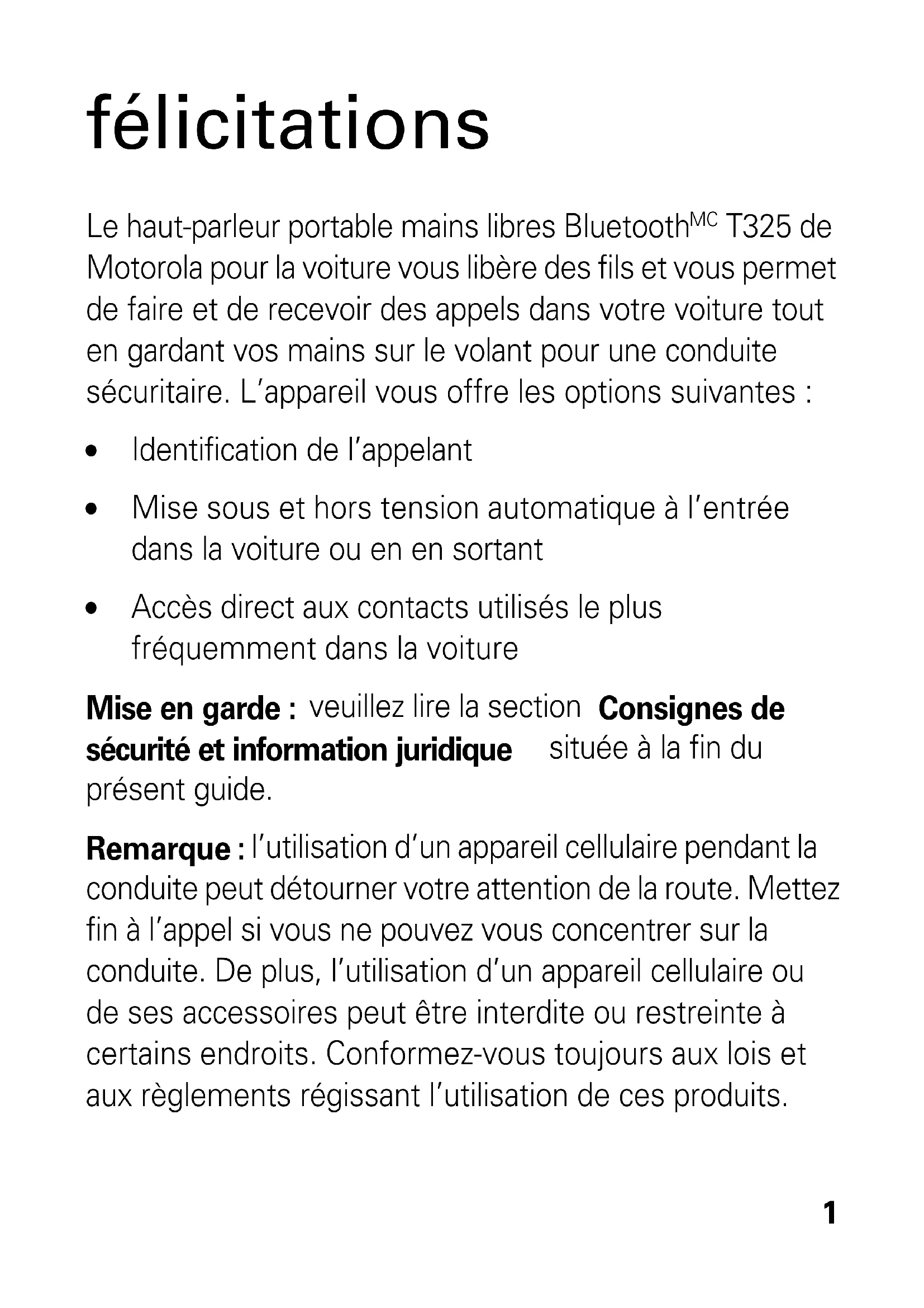 Après avoir téléchargé les contacts de mon annuaire, je suis incapable d’accéder à tous les contacts au moyen de mon hautparleur. Pour rendre l’utilisation conviviale, le hautparleur prend en charge l’accès aux contacts préférés et la composition de leurs numéros (choix de 10 ou 25 entrées). Cela vous évite de devoir faire défiler la liste qui peut contenir 1 500 contacts. Le hautparleur ne télécharge pas les contacts de l’annuaire. Il se peut que certains téléphones ne prennent pas en charge le téléchargement de l’annuaire. Si c’est le cas de votre téléphone, vous pouvez sélectionner des contacts et les télécharger (consultez la page 16).23 Renseignements généraux et de sécurité Renseign ements de sécur ité RENSEIGNEMENTS IMPORTANTS POUR UN FONCTIONNEMENT SÛR ET EFFICACE. LISEZ CES RENSEIGNEMENTS AVANT D’UTILISER VOTRE APPAREIL. Accessoires approuvés L’utilisation d’accessoires non approuvés par Motorola, y compris mais sans s’y limiter, les batteries, les antennes et les couvertures amovibles, peut entraîner le fonctionnement du dispositif mobile à des niveaux d’énergie RF supérieurs aux normes d’exposition établies et annuler la garantie de votre dispositif mobile. Pour obtenir une liste des accessoires approuvés par Motorola, visitez notre site Web à : www.motorola.com