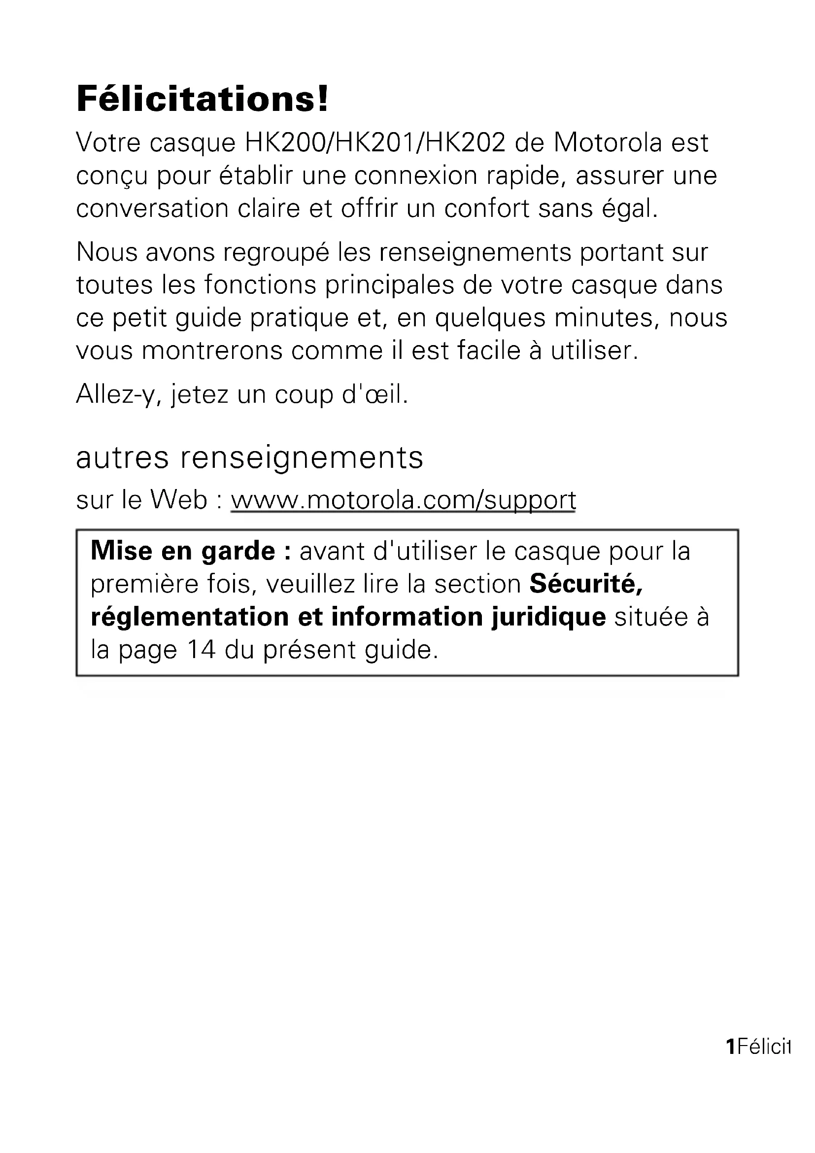 Todas las demás directivas importantes de la Unión Europea Lo anterior es un ejemplo de un típico Número de aprobación del producto. Puede ver la declaración de conformidad de su producto (DoC, Declaration of Conformity) con la Directiva 1999/5/EC (la Directiva R&TTE) en www.motorola.com/rtte , para encontrar su DoC, ingrese el número de aprobación del producto que aparece en la etiqueta de su teléfono en la barra “Buscar” del sitio Web. Número de aprobación del producto26 Motorola, Inc. Consumer Advocacy Office 600 N US Hwy 45 Libertyville, IL 60048 www.motorola.com www.motorola.com/Bluetoothsupport www.motorola.com/Bluetoothconnect Nota: no envíe el producto accesorio a la dirección anterior. Si necesita devolver el producto para reparaciones, reemplazo o servicio de garantía, comuníquese con el Centro de Atención a Clientes de Motorola al: 1-877-MOTOBLU (soporte de Motorola Bluetooth®) 1-800-331-6456 (Estados Unidos) 1-888-390-6456 (TTY/TDD Estados unidos para personas con problemas de audición) 1-800-461-4575 (Canadá) MOTOROLA y el Logotipo de la M Estilizada están registrados en la Oficina de Patentes y Marcas Registradas de los Estados Unidos. Las marcas comerciales Bluetooth pertenecen a sus respectivos dueños y son usadas por Motorola, Inc. bajo licencia. Todos los demás nombres de productos o de servicios pertenecen a sus respectivos dueños. © 2010 Motorola, Inc. Todos los Derechos Reservados. Número de Manual: 68000202619-AGuide de démarrage rapide motorola HK200 HK201 HK2021Félicitations! Félicitations! Votre casque HK200/HK201/HK202 de Motorola est conçu pour établir une connexion rapide, assurer une conversation claire et offrir un confort sans égal. Nous avons regroupé les renseignements portant sur toutes les fonctions principales de votre casque dans ce petit guide pratique et, en quelques minutes, nous vous montrerons comme il est facile à utiliser. Allezy, jetez un coup d'œil. autres renseignements sur le Web : www.motorola.com/support Mise en garde : avant d'utiliser le casque pour la première fois, veuillez lire la section Sécurité, réglementation et information juridique située à la page 14 du présent guide.2 Votre casque Votre casque les touches et les connecteurs principaux Crochet d’oreille Interrupteur d’alimentation Connecteur de charge micro-USB Touche de volume Touche d'appel Écouteur Voyant lumineux Microphone3Charge Charge à vos marques, prêt, partez Remarque : le casque n’est pas en fonction pendant la charge de la batterie. Remarque : la batterie est conçue pour durer aussi longtemps que votre appareil. Elle ne devrait être retirée que lorsque l’appareil est envoyé à un centre de recyclage. Toute tentative de retrait ou de remplacement de la batterie endommagera le casque. Voyant lumineux Rouge/Violet – charge en cours Bleu – complètement chargé4 Fonctions de base Fonctions de base quelques notions de base pour vous mettre en selle Activation et désactivation Pour mettre votre casque sous tension ou hors tension, utilisez l’interrupteur d’alimentation tel qu’illustré. Port du casque Fléchissez le crochet et passezle sur votre oreille tel qu’illustré. Assurezvous d’insérer le hautparleur dans votre conduit auditif et de positionner le microphone vers votre bouche. À la livraison, le casque est prêt à être porté sur l’oreille droite. Si vous voulez le porter sur l’oreille gauche, retirez simplement le crochet, tournezle, puis installezle tel qu’illustré. hors tension sous tension5Appariement et connexion Appariement et connexion branchez et le tour est joué Remarque : les messagesguides vocaux ne sont qu’en anglais.
