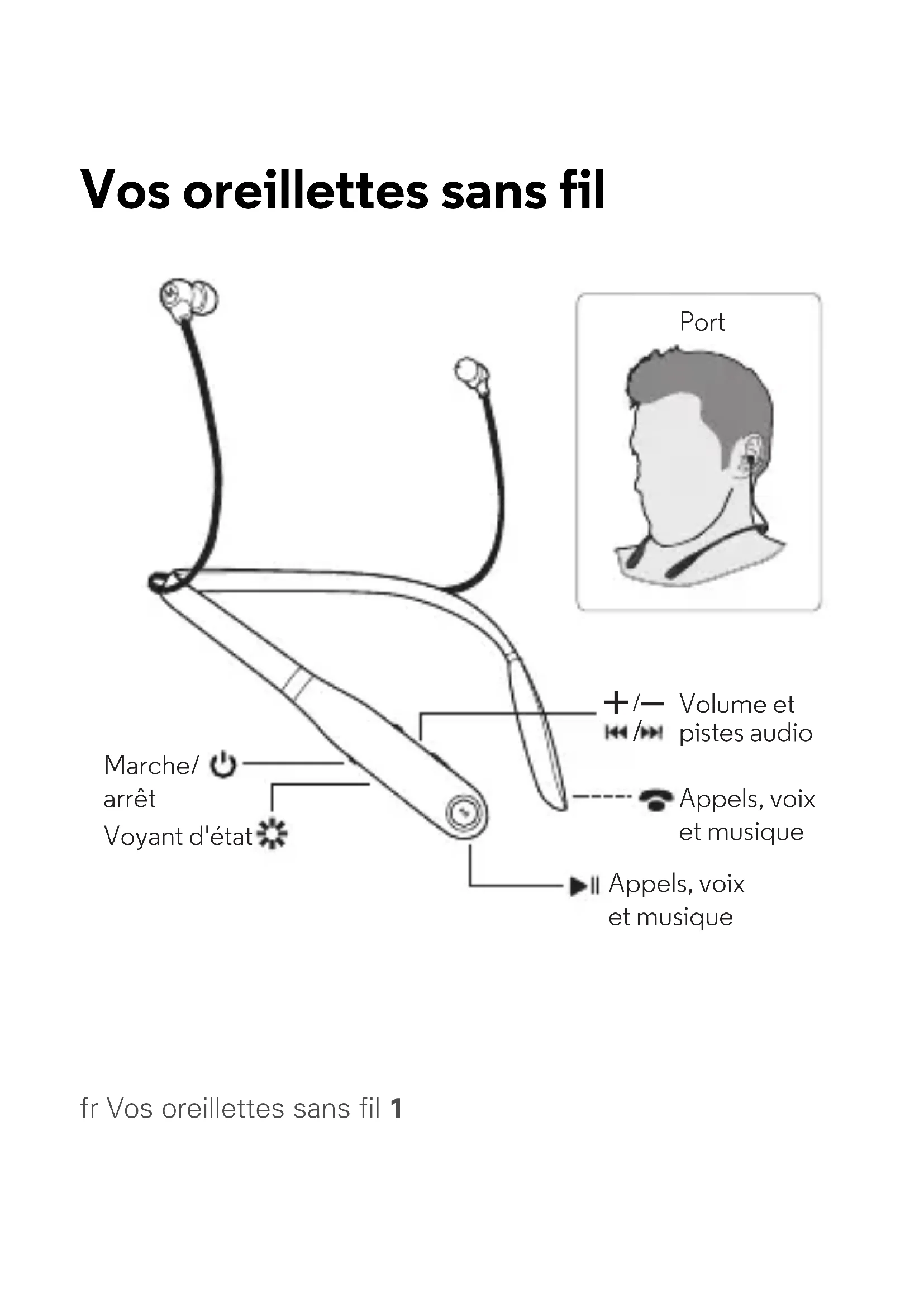 oufr Contrôle des appels, de la voix et de la musique 7 Voix passer une commande vocale appuyez de manière prolongée sur , puis prononcez une commande ou8 Paramètres avancés fr Paramètres avancés Voyants d'état Mode d'association bleu clignotant Connecté bleu fixe Batterie faible rouge clignotant En charge rouge fixe Charge terminée vert fixe Vérification du niveau de charge vert fixe pendant deux secondes Mise hors tension bleu apparaissant/ disparaissant en fondufr Paramètres avancés 9 Vérification du niveau de charge Remarque : disponible sur certains modèles uniquement. Remarque : votre batterie est conçue pour fonctionner pendant toute la vie du produit. Elle doit être retirée uniquement par un centre de recyclage. Toute tentative de retrait ou de remplacement de la batterie risque d'endommager le produit et peut annuler votre garantie. Marche/arrêt Appuyez rapidement pour entendre le temps de lecture restant.10 Paramètres avancés fr Réinitialisation Désactivez le Bluetooth sur tous les appareils connectés. Allumez les oreillettes sans fil, puis appuyez de manière prolongée sur et les deux boutons de volume jusqu'à ce que le voyant d'état clignote en rouge et bleu. Une tonalité sera émise. Remarque : ce produit contient des aimants et peut endommager les supports d'informations magnétiques, tels que les bandes des cartes de crédit et les cartes d'identité. Deuxième appareil Vous utilisez un téléphone et une tablette ? Ou deux téléphones ? Connectez les deux appareils en même temps. 1 Procédez à l'association avec votre premier appareil en suivant les étapes de la section « Associer par Bluetooth™ », page 4. oufr Paramètres avancés 11 2 Désactivez le Bluetooth sur votre premier appareil (téléphone, tablette ou ordinateur). 3 Éteignez les oreillettes sans fil, puis rallumez-les. 4 Procédez à l'association avec votre deuxième appareil en suivant les étapes de la section « Associer par Bluetooth™ », page 4. 5 Sur votre premier appareil, activez à nouveau le Bluetooth pour le connecter également. Une tonalité sera émise lorsque le premier appareil se connecte. Conseil : pour changer d'appareil et écouter du son provenant du deuxième appareil connecté, mettez en pause l'appareil diffusant de la musique, puis lancez la lecture sur le deuxième appareil.12 Aide et plus fr Aide et plus