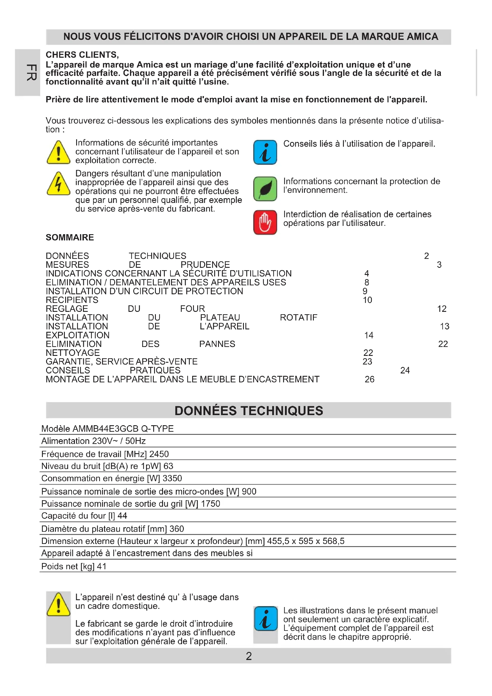 Les illustrations dans le présent manuel ont seulement un caractère explicatif. L’équipement complet de l’appareil est décrit dans le chapitre approprié.Modèle AMMB44E3GCB Q-TYPEAlimentation 230V~ / 50HzFréquence de travail [MHz] 2450Niveau du bruit [dB(A) re 1pW] 63Consommation en énergie [W] 3350Puissance nominale de sortie des micro-ondes [W] 900Puissance nominale de sortie du gril [W] 1750Capacité du four [l] 44Diamètre du plateau rotatif [mm] 360Dimension externe (Hauteur x largeur x profondeur) [mm] 455,5 x 595 x 568,5Appareil adapté à l’encastrement dans des meubles siPoids net [kg] 41