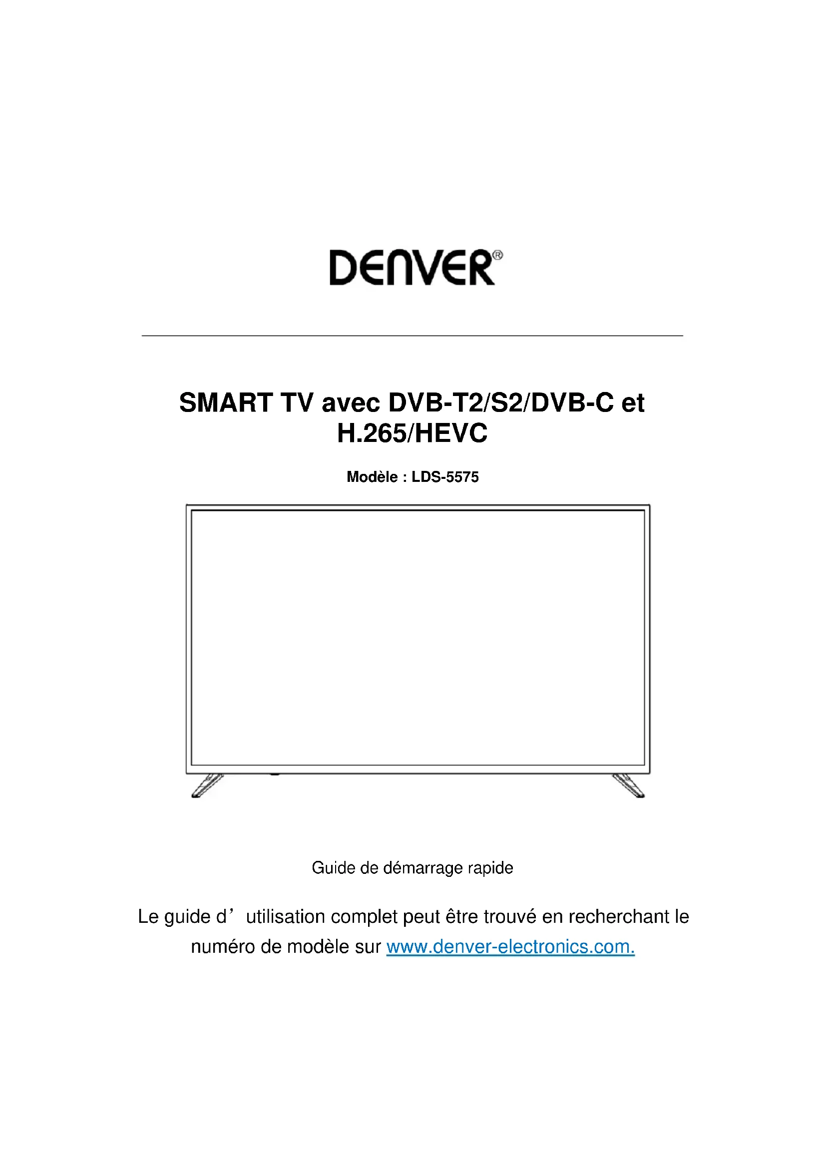 Guide de démarrage rapide Le guide d’utilisation complet peut être trouvé en recherchant le numéro de modèle sur www.denver-electronics.com.FRA-1 Précautions de sécurité CONSIGNES DE SÉCURITÉ IMPORTANTES – À LIRE ATTENTIVEMENT AVANT L’UTILISATION. Lisez les consignes de sécurité suivantes figurant à l'arrière de la télé.