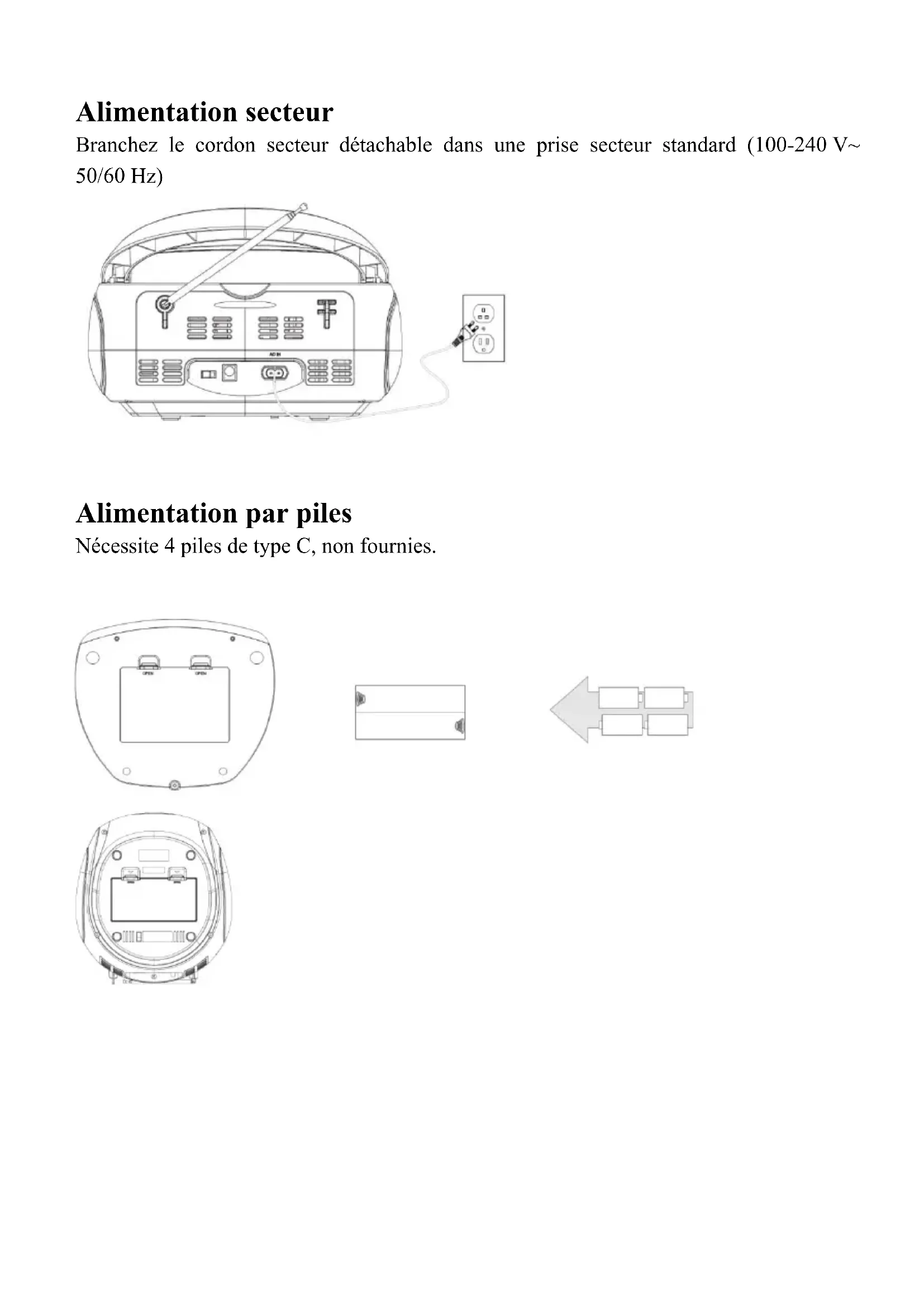 Alimentation par piles Nécessite 4 piles de type C, non fournies.Écoute de la radio FM 1.Réglez le fonctionnement en mode FM en appuyant sur la touche FUN. Déployez l’antenne FM pour améliorer la réception radio FM. 2.Appuyez brièvement sur la touche PRÉCÉDENT ou SUIVANT pour régler la station disponible précédente ou suivante. 3.Maintenez la touche PRÉCÉDENT ou SUIVANT enfoncée pour effectuer une recherche automatique de la station de radio précédente ou suivante. 4.Maintenez la touche LECTURE/PAUSE enfoncée pour rechercher et enregistrer automatiquement les stations de radio. Jusqu’à 30 stations de radio peuvent être enregistrées. Radio DAB 1.Réglez le fonctionnement en mode DAB en appuyant sur la touche FUN. 2.Maintenez la touche LECTURE/PAUSE enfoncée pour rechercher et enregistrer automatiquement les stations de radio DAB. 3.Appuyez brièvement sur la touche PRÉCÉDENT/SUIVANT pour mettre en surbrillance une sous-station et appuyez sur la touche ENTER pour la sélectionner. 4.Appuyez brièvement sur la touche INFO pour afficher les détails de la station. Fonction BT