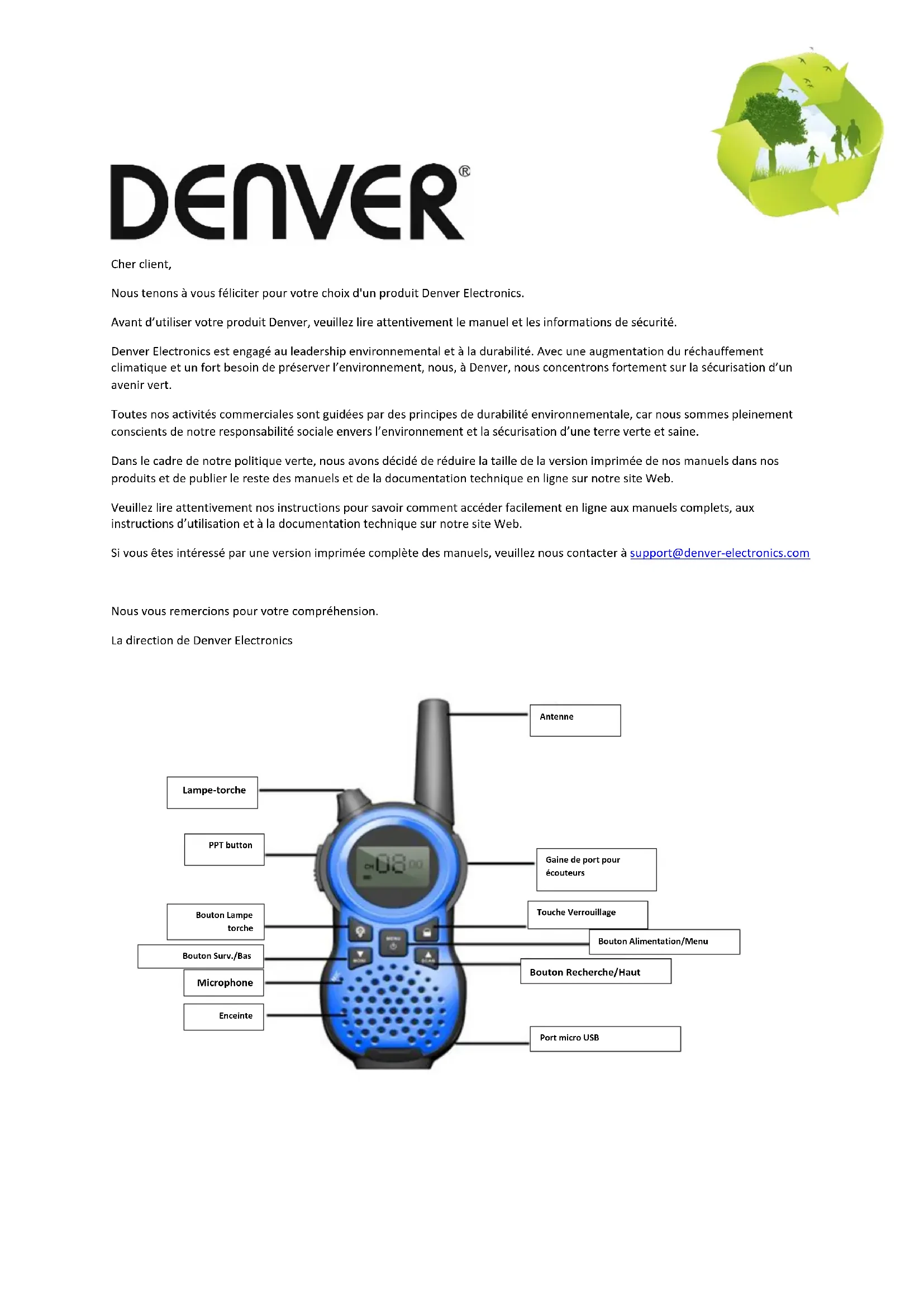 Maintenez le bouton Alimentation/Menu enfoncé jusqu’à entendre un bip. Régler le volume : Vous disposez de 8 niveaux de volume prédéfinis. Pour augmenter le volume, appuyez sur le bouton Recherche/Haut. Pour diminuer le volume, appuyez sur le bouton Surv./Bas. Appuyez ensuite sur le bouton PTT ou Alimentation/Menu pour confirmer. Changer de canal Vous disposez de canaux dans la bande de fréquences légale. Pour communiquer avec un autre appareil, vous devez être sur le même canal. Pour changer de canal, appuyez une fois sur le bouton Alimentation/Menu après avoir allumé votre appareil, et utilisez les boutons Haut/Bas pour faire défiler les canaux jusqu’à celui que vous souhaitez. Pour régler le canal souhaité, appuyez sur le bouton PTT pour confirmer les modifications. Votre appareil est juste unidirectionnel. Pendant que vous parlez, vous ne pouvez pas recevoir de transmission. Votre appareil utilise une bande à licence libre. Identifiez-vous toujours lorsque vous transmettez sur le même canal. IMPORTANT : Avant de transmettre sur un canal, écoutez pour vérifier qu’il n’est pas déjà utilisé. Votre manuel d’utilisation plus avancé peut être trouvé sur notre site Web : www.denver-electronics.com Entrez dans le champ de recherche et écrivez votre numéro de modèle (WTA-446), puis les manuels d’utilisation se trouvent à côté des images, sous le numéro de modèle.