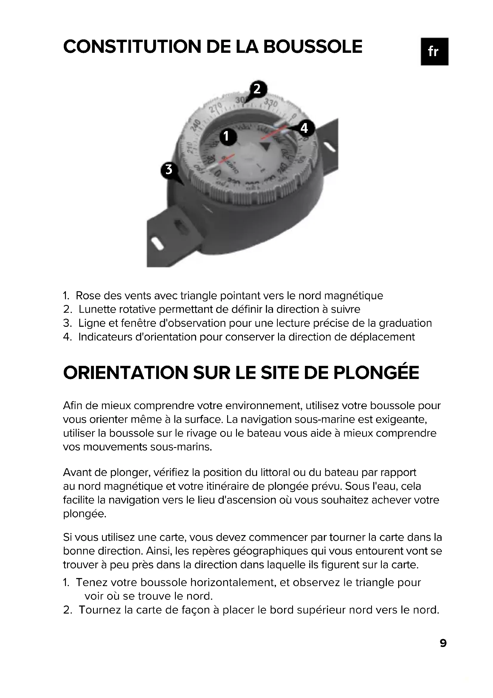 ORIENTATION SUR LE SITE DE PLONGÉE Afin de mieux comprendre votre environnement, utilisez votre boussole pour vous orienter même à la surface. La navigation sous-marine est exigeante, utiliser la boussole sur le rivage ou le bateau vous aide à mieux comprendre vos mouvements sous-marins. Avant de plonger, vérifiez la position du littoral ou du bateau par rapport au nord magnétique et votre itinéraire de plongée prévu. Sous l'eau, cela facilite la navigation vers le lieu d'ascension où vous souhaitez achever votre plongée. Si vous utilisez une carte, vous devez commencer par tourner la carte dans la bonne direction. Ainsi, les repères géographiques qui vous entourent vont se trouver à peu près dans la direction dans laquelle ils figurent sur la carte.