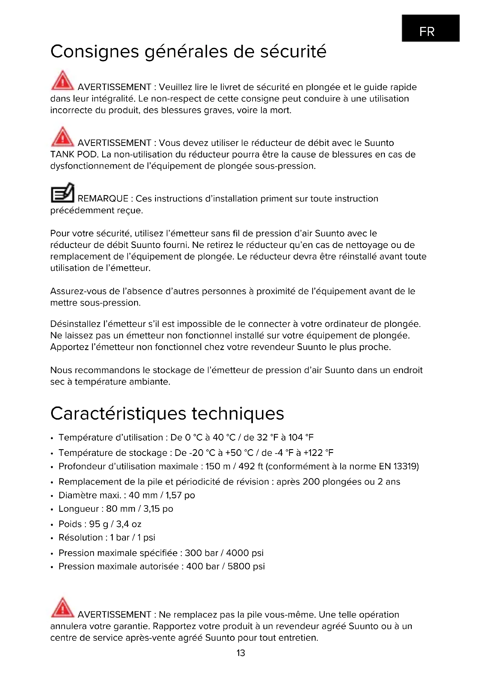 TANK POD. La non-utilisation du réducteur pourra être la cause de blessures en cas de dysfonctionnement de l’équipement de plongée sous-pression. REMARQUE : Ces instructions d’installation priment sur toute instruction précédemment reçue. Pour votre sécurité, utilisez l’émetteur sans fil de pression d’air Suunto avec le réducteur de débit Suunto fourni. Ne retirez le réducteur qu’en cas de nettoyage ou de remplacement de l’équipement de plongée. Le réducteur devra être réinstallé avant toute utilisation de l’émetteur. Assurez-vous de l’absence d’autres personnes à proximité de l’équipement avant de le mettre sous-pression. Désinstallez l’émetteur s’il est impossible de le connecter à votre ordinateur de plongée. Ne laissez pas un émetteur non fonctionnel installé sur votre équipement de plongée. Apportez l’émetteur non fonctionnel chez votre revendeur Suunto le plus proche. Nous recommandons le stockage de l’émetteur de pression d’air Suunto dans un endroit sec à température ambiante. Caractéristiques techniques