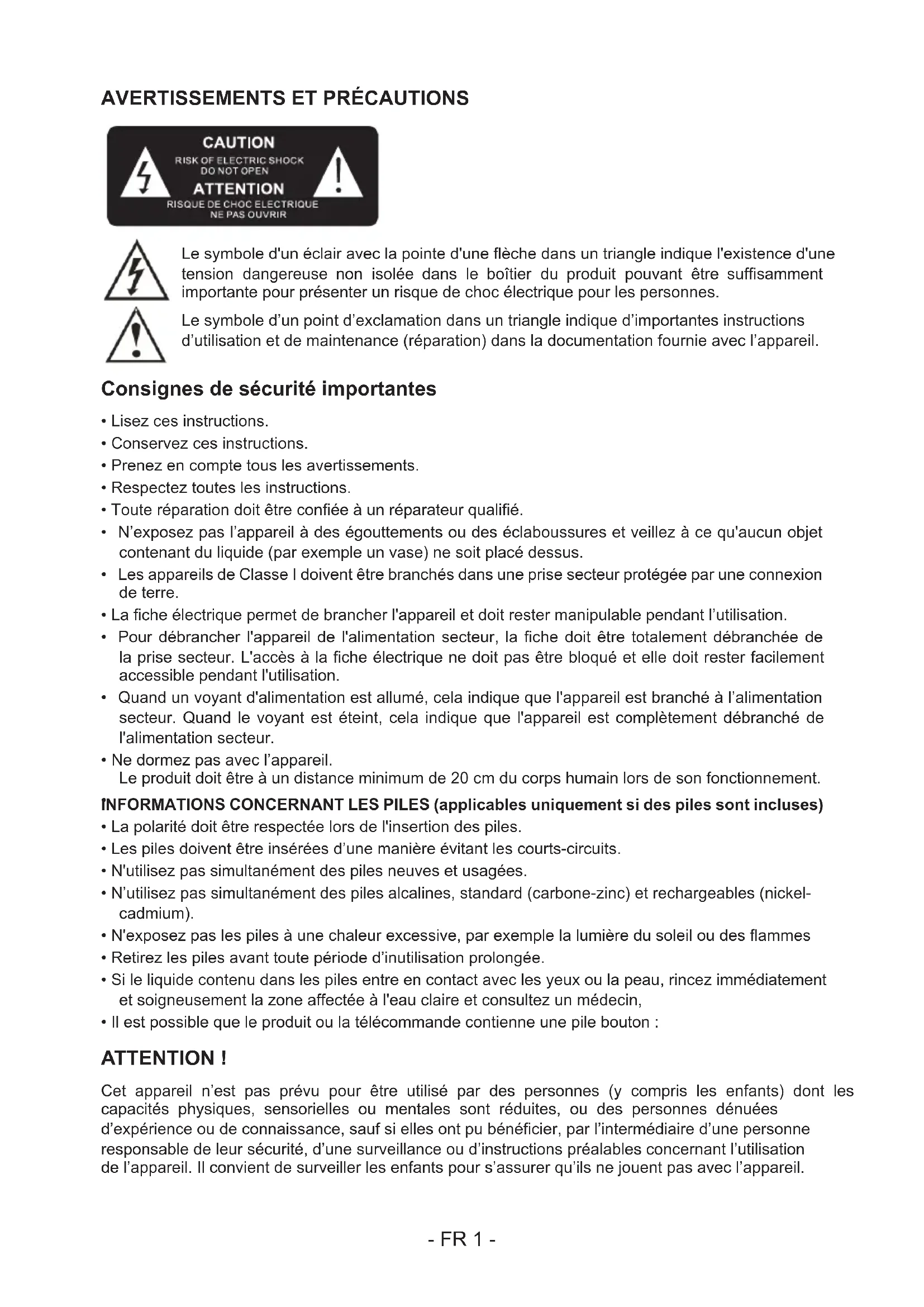 - Il est possible que le produit ou la télécommande contienne une pile bouton : ATTENTION ! Cet appareil n’est pas prévu pour être utilisé par des personnes (y compris les enfants) dont les capacités physiques, sensorielles ou mentales sont réduites, ou des personnes dénuées d’expérience ou de connaissance, sauf si elles ont pu bénéficier, par l’intermédiaire d’une personne responsable de leur sécurité, d’une surveillance ou d’instructions préalables concernant l’utilisation de l’appareil. Il convient de surveiller les enfants pour s’assurer qu’ils ne jouent pas avec l’appareil. - FR 1 -- FR 2 - AVERTISSEMENT CONCERNANT LES PILES : N’avalez pas la/les piles. Risque de brûlure chimique. Ce produit contient une pile ou des piles. Si une pile est avalée, elle peut provoquer de graves brûlures internes en 2 heures à peine et causer la mort. Conservez les piles neuves et usagées hors de portée des enfants ou de toute personne vulnérable. Si le compartiment à pile(s) ne se fermait plus correctement, arrêtez d’utiliser le produit. Si jamais une pile était ingérée, consultez immédiatement un médecin. REMARQUES IMPORTANTES : Risque d’explosion de la pile si celle-ci n’est pas correctement remplacée ou si l’appareil n’est pas utilisé durant un certain temps. Remplacez la pile avec un modèle identique ou équivalent. Double isolation Courant continu Courant alternatif Symbole d’usage en intérieur Respect de l’environnement Votre produit est conçu et fabriqué avec des matériaux et composants de haute qualité qui peuvent être recyclés et réutilisés. Lorsque le symbole d’une poubelle barrée sur roues se trouve sur un produit, cela signifie que le produit est couvert par la Directive Européenne 2002/96/CE. Veuillez vous informer du système local de collecte séparée pour les produits électriques et électroniques. Veuillez agir selon les règles locales et ne jetez pas vos anciens produits avec les ordures ménagères. En assurant l’élimination de ce produit, vous aidez également à prévenir les conséquences potentiellement négatives pour l’environnement et la santé humaine. Conformité Ce produit est conforme aux exigences des directives de l’Union Européenne relatives aux interférences radio. Cet appareil comporte ce marquage.- FR 3 - Alimentation par piles