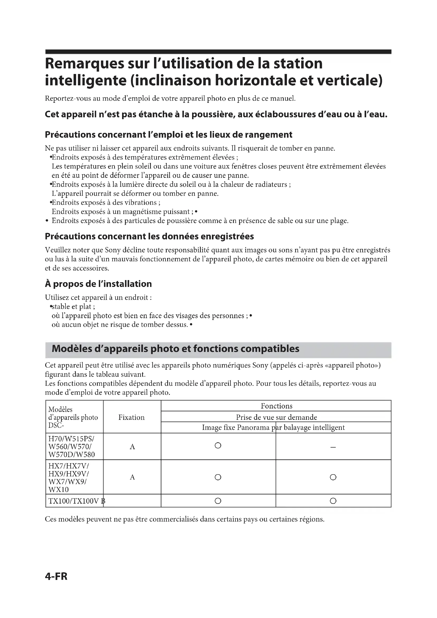 - PILES USEES. À l’intention des clients aux É.-U. AVERTISSEMENT Par la présente, vous êtes avisé du fait que tout changement ou toute modification ne faisant pas l’objet d’une autorisation expresse dans le présent manuel pourrait annuler votre droit d’utiliser l’appareil. Note L’appareil a été testé et est conforme aux exigences d’un appareil numérique de Classe B, conformément à la Partie 15 de la réglementation de la FCC. Ces critères sont conçus pour fournir une protection raisonnable contre les interférences nuisibles dans un environnement résidentiel. L’appareil génère, utilise et peut émettre des fréquences radio; s’il n’est pas installé et utilisé conformément aux instructions, il pourrait provoquer des interférences nuisibles aux communications radio. Cependant, il n’est pas possible de garantir que des interférences ne seront pas provoquées dans certaines conditions particulières. Si l’appareil devait provoquer des interférences nuisibles à la réception radio ou à la télévision, ce qui peut être démontré en allumant et éteignant l’appareil, il est recommandé à l’utilisateur d’essayer de corriger cette situation par l’une ou l’autre des mesures suivantes : – Réorienter ou déplacer l’antenne réceptrice.3-FR Table des matières Remarques sur l’utilisation de la station intelligente (inclinaison horizontale et verticale) p. 4