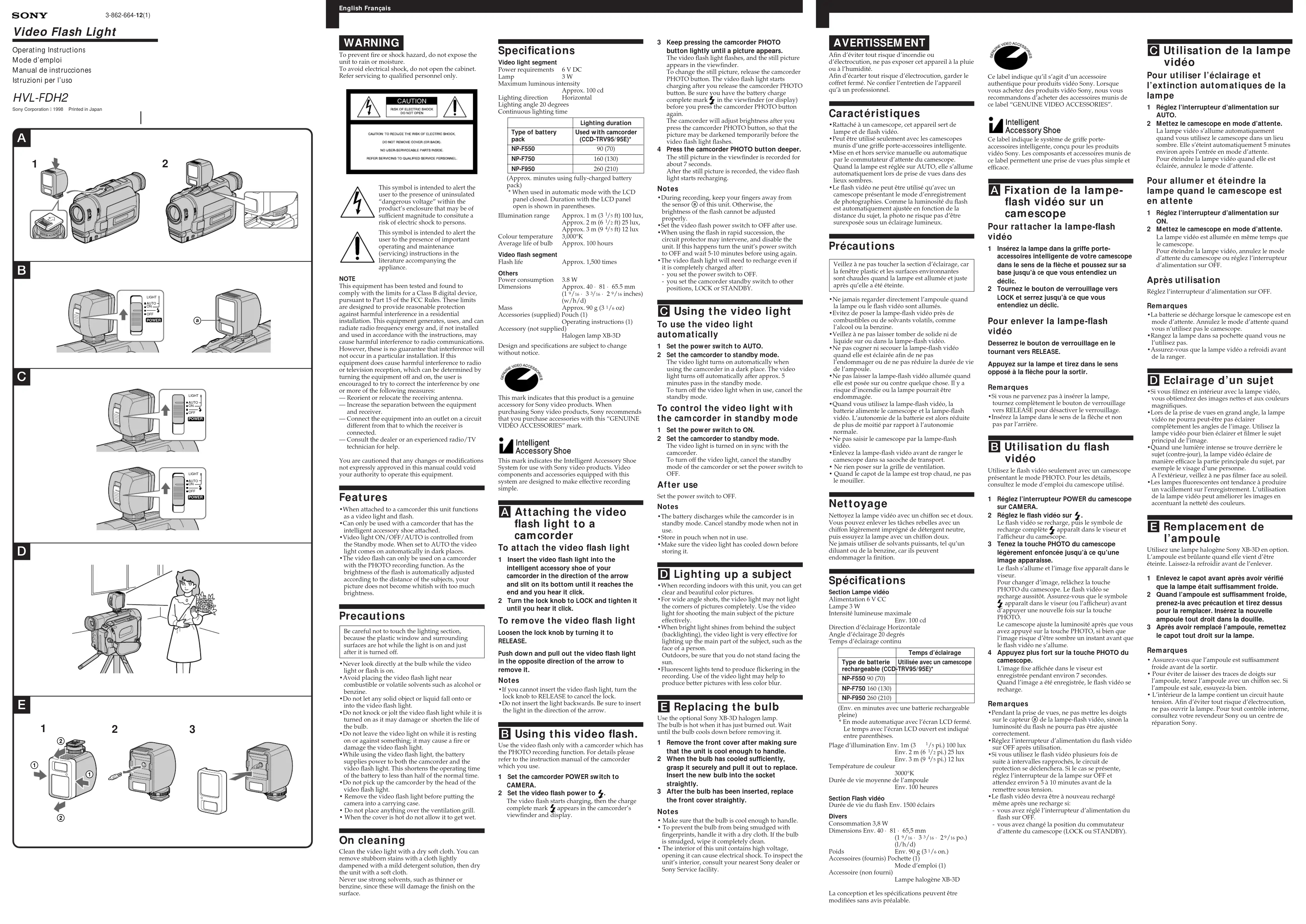 - Si vous filmez en intérieur avec la lampe vidéo,vous obtiendrez des images nettes et aux couleursmagnifiques.•Lors de la prise de vues en grand angle, la lampevidéo ne pourra peut-être pas éclairercomplètement les angles de l’image. Utilisez lalampe vidéo pour bien éclairer et filmer le sujetprincipal de l’image.•Quand une lumière intense se trouve derrière lesujet (contre-jour), la lampe vidéo éclaire demanière efficace la partie principale du sujet, parexemple le visage d’une personne.A l’extérieur, veillez à ne pas filmer face au soleil.•Les lampes fluorescentes ont tendance à produireun vacillement sur l’enregistrement. L’utilisationde la lampe vidéo peut améliorer les images enaccentuant la netteté des couleurs. E Remplacement de l’ampoule Utilisez une lampe halogène Sony XB-3D en option.L’ampoule est brûlante quand elle vient d’êtreéteinte. Laissez-la refroidir avant de l’enlever.1 Enlevez le capot avant après avoir vérifiéque la lampe était suffisamment froide.2 Quand l’ampoule est suffisamment froide,prenez-la avec précaution et tirez dessuspour la remplacer. Insérez la nouvelleampoule tout droit dans la douille.3 Après avoir remplacé l’ampoule, remettezle capot tout droit sur la lampe.Remarques• Assurez-vous que l’ampoule est suffisammentfroide avant de la sortir.• Pour éviter de laisser des traces de doigts surl’ampoule, tenez l’ampoule avec un chiffon sec. Sil’ampoule est sale, essuyez-la bien.• L’intérieur de la lampe contient un circuit hautetension. Afin d’éviter tout risque d’électrocution,ne pas ouvrir la lampe. Pour tout contrôle interne,consultez votre revendeur Sony ou un centre deréparation Sony.Ce label indique qu’il s’agit d’un accessoireauthentique pour produits vidéo Sony. Lorsquevous achetez des produits vidéo Sony, nous vousrecommandons d’acheter des accessoires munis dece label “GENUINE VIDEO ACCESSORIES”.Ce label indique le système de griffe porte-accessoires intelligente, conçu pour les produitsvidéo Sony. Les composants et accessoires munis dece label permettent une prise de vues plus simple etefficace. A Fixation de la lampe- flash vidéo sur un camescope Pour rattacher la lampe-flash vidéo 1 Insérez la lampe dans la griffe porte-accessoires intelligente de votre camescopedans le sens de la flèche et poussez sur sabase jusqu’à ce que vous entendiez undéclic.2 Tournez le bouton de verrouillage versLOCK et serrez jusqu’à ce que vousentendiez un déclic. Pour enlever la lampe-flash vidéo Desserrez le bouton de verrouillage en letournant vers RELEASE.Appuyez sur la lampe et tirez dans le sensopposé à la flèche pour la sortir.Remarques•Si vous ne parvenez pas à insérer la lampe,tournez complètement le bouton de verrouillagevers RELEASE pour désactiver le verrouillage.•Insérez la lampe dans le sens de la flèche et nonpas par l’arrière. B Utilisation du flash vidéo Utilisez le flash vidéo seulement avec un camescopeprésentant le mode PHOTO. Pour les détails,consultez le mode d’emploi du camescope utilisé.1 Réglez l’interrupteur POWER du camescopesur CAMERA.2 Réglez le flash vidéo sur Le flash vidéo se recharge, puis le symbole derecharge complète apparaît dans le viseur etl’afficheur du camescope.3 Tenez la touche PHOTO du camescopelégèrement enfoncée jusqu’à ce qu’uneimage apparaisse.Le flash s’allume et l’image fixe apparaît dans leviseur.Pour changer d’image, relâchez la touchePHOTO du camescope. Le flash vidéo serecharge aussitôt. Assurez-vous que le symbole apparaît dans le viseur (ou l’afficheur) avantd’appuyer une nouvelle fois sur la touchePHOTO.Le camescope ajuste la luminosité après que vousavez appuyé sur la touche PHOTO, si bien quel’image risque d’être sombre un instant avant quele flash vidéo ne s’allume.4 Appuyez plus fort sur la touche PHOTO ducamescope.L’image fixe affichée dans le viseur estenregistrée pendant environ 7 secondes.Quand l’image a été enregistrée, le flash vidéo serecharge.Remarques•Pendant la prise de vues, ne pas mettre les doigtssur le capteur a de la lampe-flash vidéo, sinon laluminosité du flash ne pourra pas être ajustéecorrectement.•Réglez l’interrupteur d’alimentation du flash vidéosur OFF après utilisation.•Si vous utilisez le flash vidéo plusieurs fois desuite à intervalles rapprochés, le circuit deprotection se déclenchera. Si le cas se présente,réglez l’interrupteur de la lampe sur OFF etattendez environ 5 à 10 minutes avant de laremettre sous tension.•Le flash vidéo devra être à nouveau rechargémême après une recharge si:- vous avez réglé l’interrupteur d’alimentation duflash sur OFF.- vous avez changé la position du commutateurd’attente du camescope (LOCK ou STANDBY).