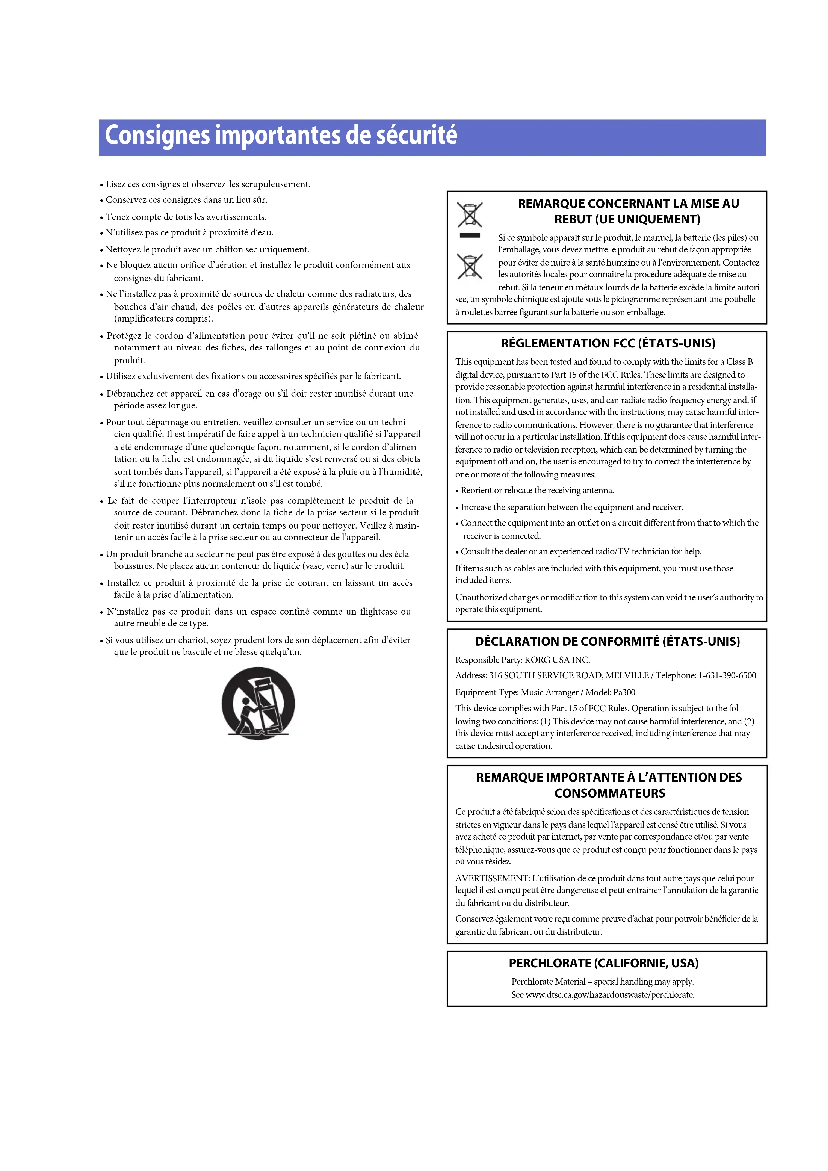 - lequel il est conçu peut être dangereuse et peut entraîner l’annulation de la garantie du fabricant ou du distributeur. Conservez également votre reçu comme preuve d’achat pour pouvoir bénéficier de la garantie du fabricant ou du distributeur. PERCHLORATE (CALIFORNIE, USA) Perchlorate Material – special handling may apply. See www.dtsc.ca.gov/hazardouswaste/perchlorate.Coupure d’alimentation automatique Pour économiser l’énergie, le Pa300 se met automatiquement hors tension (standby) après deux heures d’inactivité (ni jeu, ni pression sur un bouton ou sur l’écran tactile). Sauvegardez donc vos données (Performances, Styles, morceaux etc.) avant de faire une pause prolongée. Gestion des données Les données de la mémoire peuvent parfois être perdues suite à une erreur de manipulation. Sauvegardez donc vos données importantes en mémoire interne ou sur un dispositif USB externe. Korg décline toute responsabilité pour des dommages résultant de la perte de données. Entretien Nettoyez le boîtier de l’appareil avec un chiffon propre et sec. Ne vous servez pas d’agents de nettoyage liquides tels que du ben- zène ou du diluant, ni de nettoyants inflammables. Nettoyez l’écran avec un chiffon en coton doux. Certaines tex- tures comme les mouchoirs en papier risquent de le griffer et de l’endommager. Vous pouvez également utiliser des chiffons pour ordinateur à condition qu’ils soient spécifiquement conçus pour écrans LCD. Ne vaporisez aucun liquide directement sur l’écran LCD. Appli- quez toujours la solution sur le chiffon puis nettoyez l’écran. Saisies d’écran Certaines pages des manuels contiennent des saisies d’écran pour illustrer les descriptions des fonctions et des opérations. Les noms de sons, de Styles, de morceaux ou de paramètres ainsi que les réglages sont donnés à titre d’exemple et peuvent différer de ce que vous voyez à l’écran. Marques commerciales Acrobat et PDF sont des marques déposées de Adobe Systems Incorporated. Mac est une marque déposée de Apple, Inc. MS-DOS et Windows sont des marques déposées de Microsoft Corporation. Les autres marques commerciales ou déposées sont la propriété de leur détenteur respectif. Avis ‘Open Source’ Des parties du logiciel de ce produit sont sous copyright ©2007 “The FreeType Project” (www.freetype.org). Tous droits réser- vés. Rejet de responsabilité Les informations fournies dans ce mode d’emploi ont été soi- gneusement relues et vérifiées. Notre quête permanente d’amé- lioration de nos produits peut cependant entraîner des diffé- rences entre les caractéristiques du produit et celles figurant dans le mode d’emploi. Korg décline toute responsabilité pour toute différence entre les caractéristiques du produit et le contenu du mode d’emploi. Les caractéristiques sont susceptibles d’être modifiées sans avis préalable. Responsabilité Les produits Korg sont fabriqués conformément aux caractéris- tiques strictes et aux tension en vigueur dans chaque pays. Ces produits ne sont garantis par le distributeur Korg que dans le pays pour lequel ils sont fabriqués. Tout produit Korg vendu sans carte de garantie ou sans numéro de série ne bénéficie pas de la garantie et n’engage pas la responsabilité du fabricant/du distri- buteur. Cette clause est mise en œuvre pour votre propre protec- tion et sécurité. Entretien et service après-vente Pour tout entretien, veuillez contacter le service après-vente Korg agréé le plus proche. Si vous souhaitez plus d’informations sur les produits Korg ou pour savoir où trouver les logiciels et accessoires pour votre instrument, adressez-vous à votre distri- buteur Korg agréé. Pour obtenir les informations les plus récentes, veuillez vous rendre sur notre site web. Gardez votre clavier à jour Votre instrument peut être mis à jour avec les nouvelles versions du système d’exploitation proposées par Korg. Vous pouvez télé- charger le système d’exploitation de notre site web. Veuillez lire les instructions accompagnant le système d’exploitation. Copyright © 2016 KORG Italy Spa. Imprimé en Chine. Autres notices1 Sommaire Sommaire Introduction Bienvenue p. 4