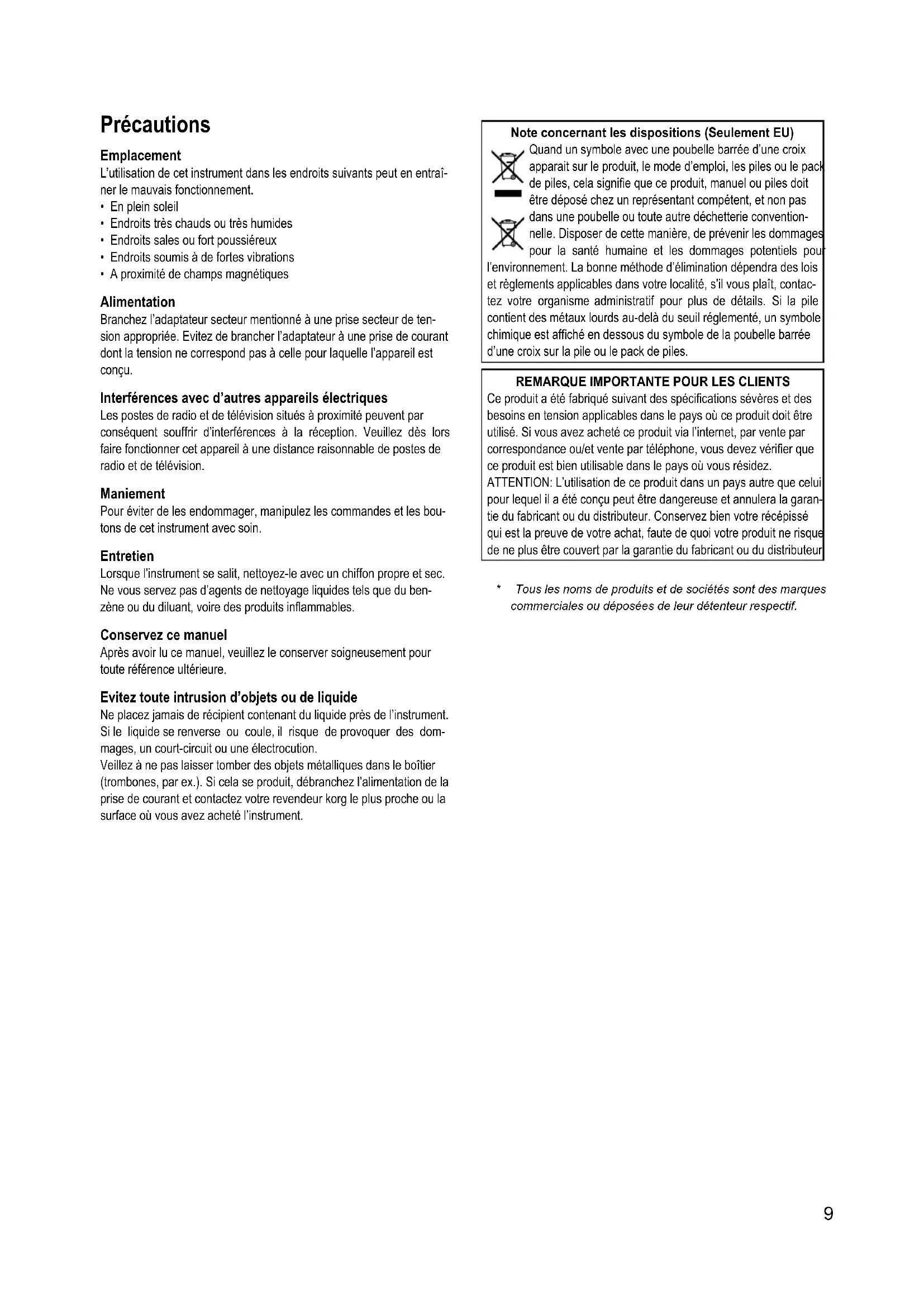 - A proximité de champs magnétiques Alimentation Branchez l’adaptateur secteur mentionné à une prise secteur de ten- sion appropriée. Evitez de brancher l’adaptateur à une prise de courant dont la tension ne correspond pas à celle pour laquelle l’appareil est conçu. Interférences avec d’autres appareils électriques Les postes de radio et de télévision situés à proximité peuvent par conséquent souffrir d’interférences à la réception. Veuillez dès lors faire fonctionner cet appareil à une distance raisonnable de postes de radio et de télévision. Maniement Pour éviter de les endommager, manipulez les commandes et les bou- tons de cet instrument avec soin. Entretien Lorsque l’instrument se salit, nettoyez-le avec un chiffon propre et sec. Ne vous servez pas d’agents de nettoyage liquides tels que du ben- zène ou du diluant, voire des produits inammables. Conservez ce manuel Après avoir lu ce manuel, veuillez le conserver soigneusement pour toute référence ultérieure. Evitez toute intrusion d’objets ou de liquide Ne placez jamais de récipient contenant du liquide près de l’instrument. Si le liquide se renverse ou coule, il risque de provoquer des dom- mages, un court-circuit ou une électrocution. Veillez à ne pas laisser tomber des objets métalliques dans le boîtier (trombones, par ex.). Si cela se produit, débranchez l’alimentation de la prise de courant et contactez votre revendeur korg le plus proche ou la surface où vous avez acheté l’instrument. Note concernant les dispositions (Seulement EU) Quand un symbole avec une poubelle barrée d’une croix apparait sur le produit, le mode d’emploi, les piles ou le pack de piles, cela signie que ce produit, manuel ou piles doit être déposé chez un représentant compétent, et non pas dans une poubelle ou toute autre déchetterie convention- nelle. Disposer de cette manière, de prévenir les dommages pour la santé humaine et les dommages potentiels pour l’environnement. La bonne méthode d’élimination dépendra des lois et règlements applicables dans votre localité, s’il vous plaît, contac- tez votre organisme administratif pour plus de détails. Si la pile contient des métaux lourds au-delà du seuil réglementé, un symbole chimique est afché en dessous du symbole de la poubelle barrée d’une croix sur la pile ou le pack de piles.