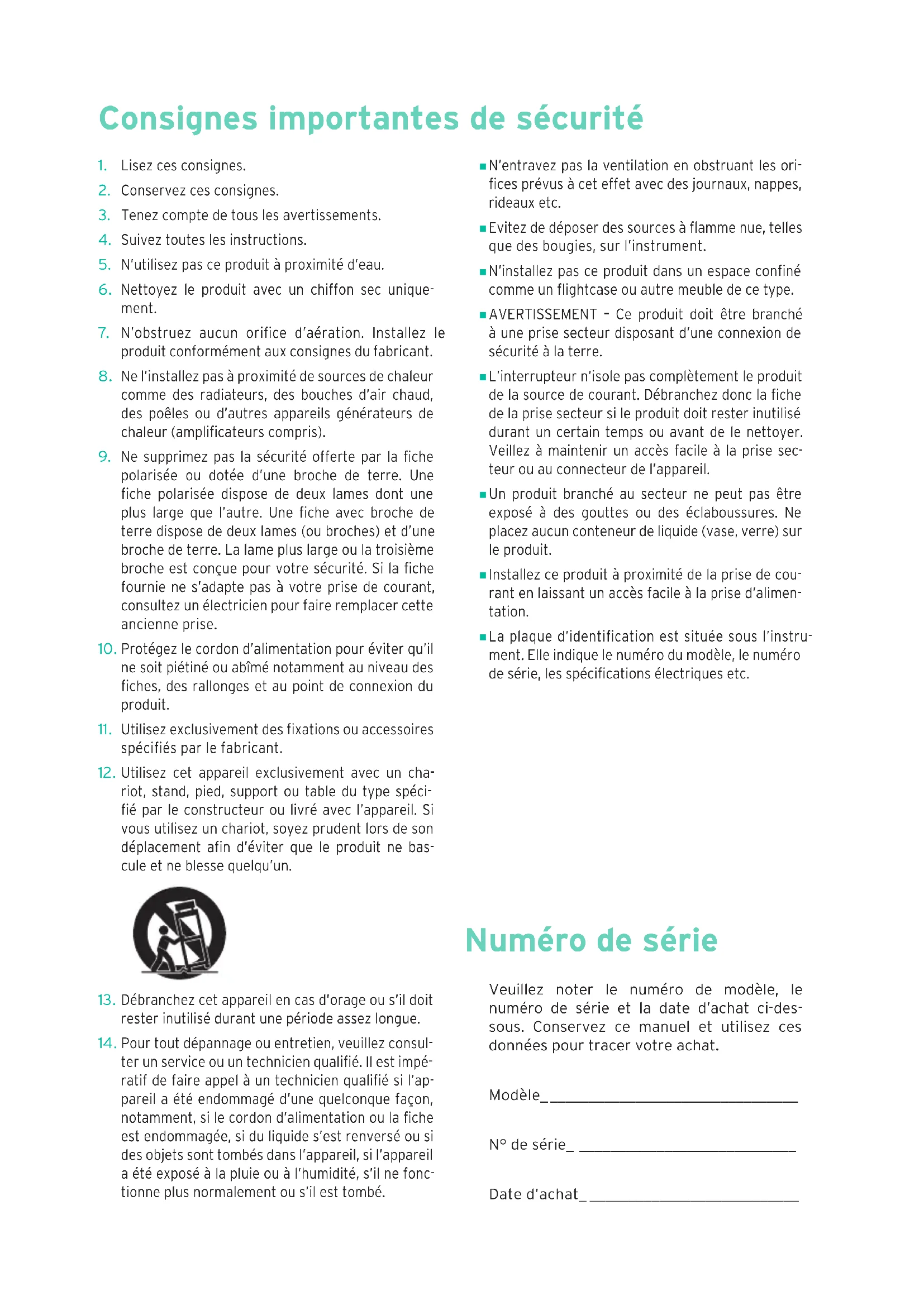 La plaque d’identification est située sous l’instru- ment. Elle indique le numéro du modèle, le numéro de série, les spécifications électriques etc. Numéro de série Veuillez noter le numéro de modèle, le numéro de série et la date d’achat ci-des- sous. Conservez ce manuel et utilisez ces données pour tracer votre achat. Modèle_ ________________________________ N° de série_ ____________________________ Date d’achat_ ___________________________AVERTISSEMENT – La pile ne peut pas être ingérée: il y a risque de brûlures par produits chimiques. Ce produit contient une pile bouton. L’ingestion de la pile bouton peut provoquer de très graves brûlures internes en 2 heures à peine pouvant entraîner le décès de la per- sonne. Conservez les piles neuves et usées hors de portée des enfants. Si le compartiment à piles ne ferme pas convenablement, cessez d’utiliser le produit et conservez-le hors de portée des enfants. Si vous pensez qu’une pile a pu être ingé- rée ou insérée dans des orifices corporels, consultez immédiatement un médecin.