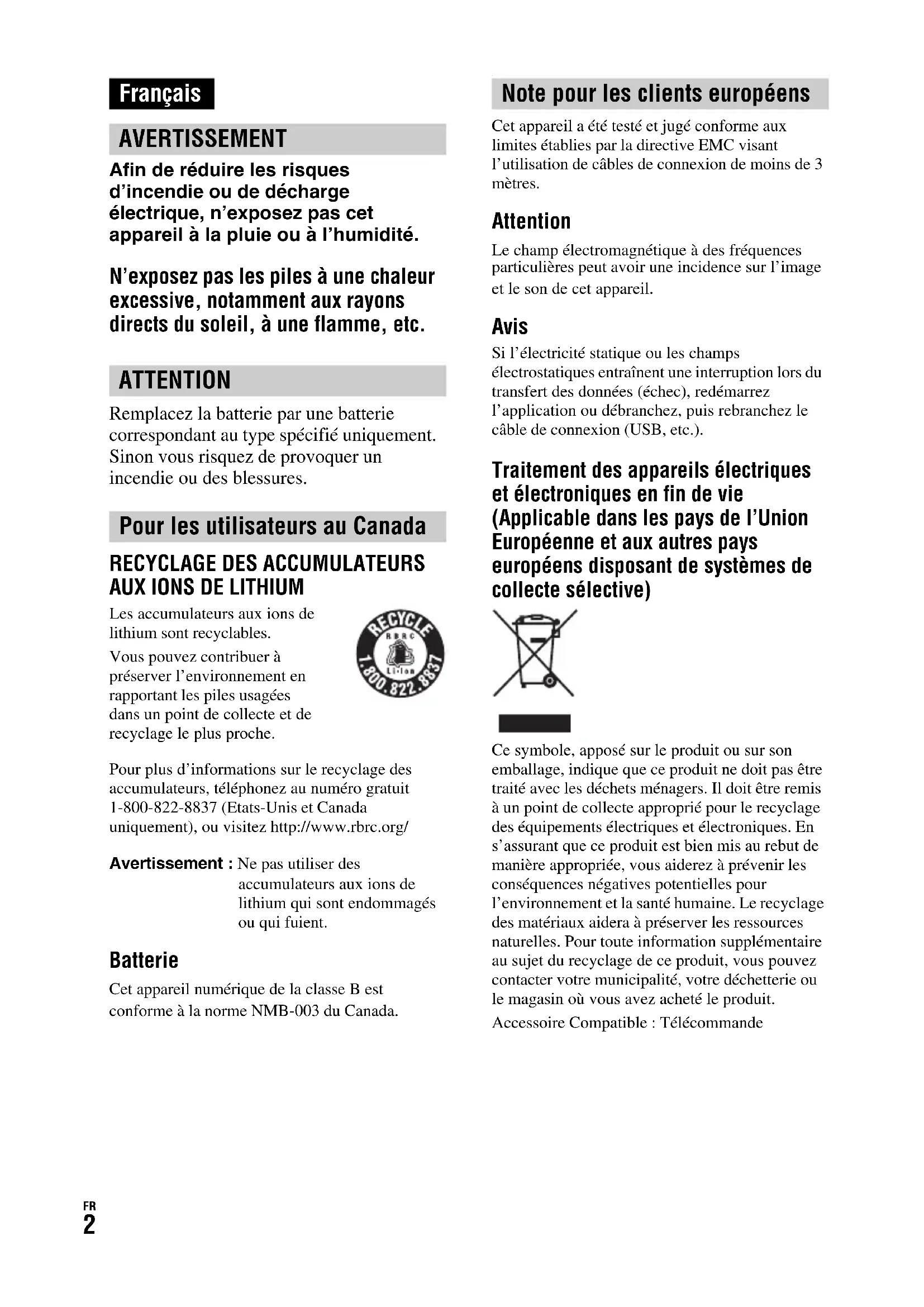 Cet appareil a été testé et jugé conforme aux limites établies par la directive EMC visant l’utilisation de câbles de connexion de moins de 3 mètres. Attention Le champ électromagnétique à des fréquences particulières peut avoir une incidence sur l’image et le son de cet appareil. Avis Si l’électricité statique ou les champs électrostatiques entraînent une interruption lors du transfert des données (échec), redémarrez l’application ou débranchez, puis rebranchez le câble de connexion (USB, etc.). Traitement des appareils électriques et électroniques en fin de vie (Applicable dans les pays de l’Union Européenne et aux autres pays européens disposant de systèmes de collecte sélective) Ce symbole, apposé sur le produit ou sur son emballage, indique que ce produit ne doit pas être traité avec les déchets ménagers. Il doit être remis à un point de collecte approprié pour le recyclage des équipements électriques et électroniques. En s’assurant que ce produit est bien mis au rebut de manière appropriée, vous aiderez à prévenir les conséquences négatives potentielles pour l’environnement et la santé humaine. Le recyclage des matériaux aidera à préserver les ressources naturelles. Pour toute information supplémentaire au sujet du recyclage de ce produit, vous pouvez contacter votre municipalité, votre déchetterie ou le magasin où vous avez acheté le produit. Accessoire Compatible : Télécommande Français AVERTISSEMENT ATTENTION Pour les utilisateurs au Canada Note pour les clients européensFR