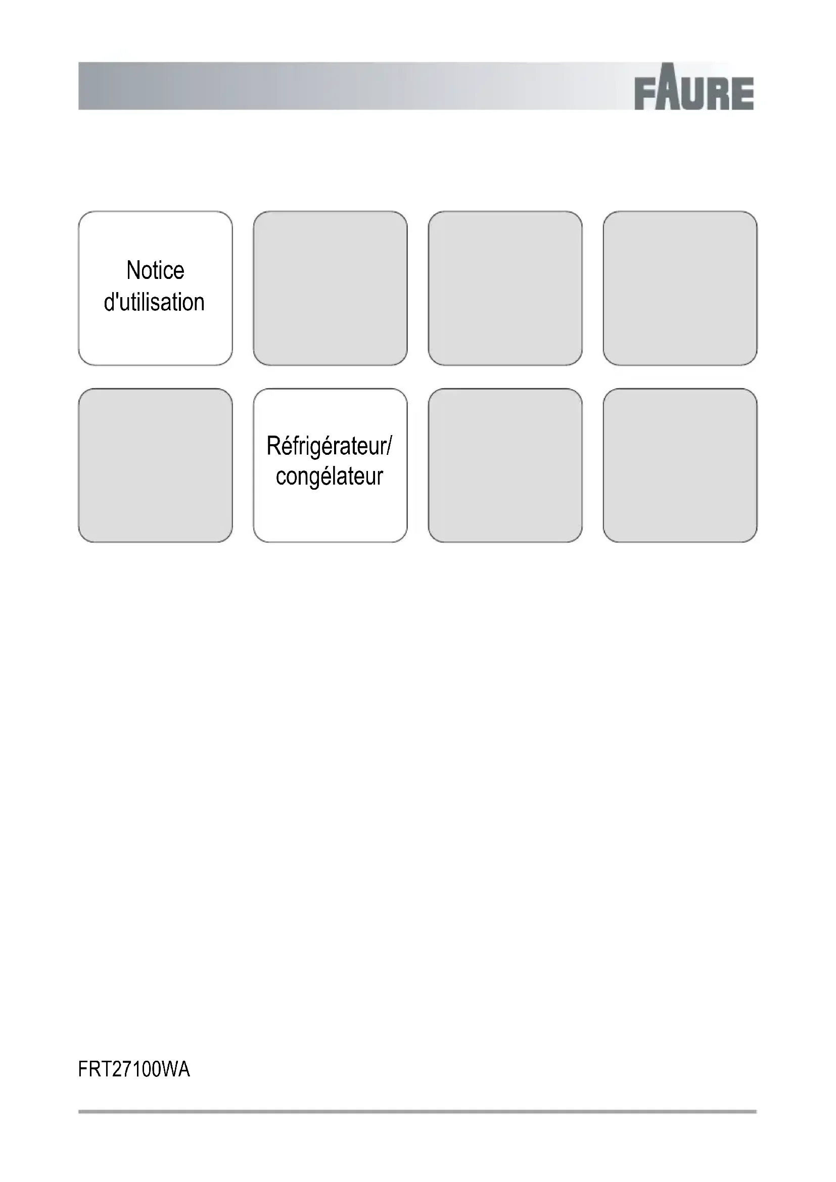 Notice d'utilisation Réfrigérateur/ congélateur FRT27100WASommaire Instructions de sécurité _ _ _ _ _ _ _ _ _ _ _ _ _ _ _ 2 Avant la première utilisation _ _ _ _ _ _ _ _ _ _ _ _ _ 4 Utilisation quotidienne _ _ _ _ _ _ _ _ _ _ _ _ _ _ _ _ 4 Conseils _ _ _ _ _ _ _ _ _ _ _ _ _ _ _ _ _ _ _ _ _ _ _ 6 Entretien et nettoyage _ _ _ _ _ _ _ _ _ _ _ _ _ _ _ _ 6 En cas d'anomalie de fonctionnement _ _ _ _ _ _ _ _ 8 Caracteristiques techniques _ _ _ _ _ _ _ _ _ _ _ _ _ 9 En matière de protection de l'environnement _ _ _ _ 10 Sous réserve de modifications. Instructions de sécurité Avant d'installer et d'utiliser cet appareil, lisez soigneu- sement les instructions fournies. Le fabricant ne peut être tenu pour responsable des dommages et blessu- res liés à une mauvaise installation ou utilisation. Con- servez toujours cette notice avec votre appareil pour vous y référer ultérieurement. Sécurité des enfants et des personnes vulnérables Avertissement Risque d'asphyxie, de blessure ou d'invalidité permanente.