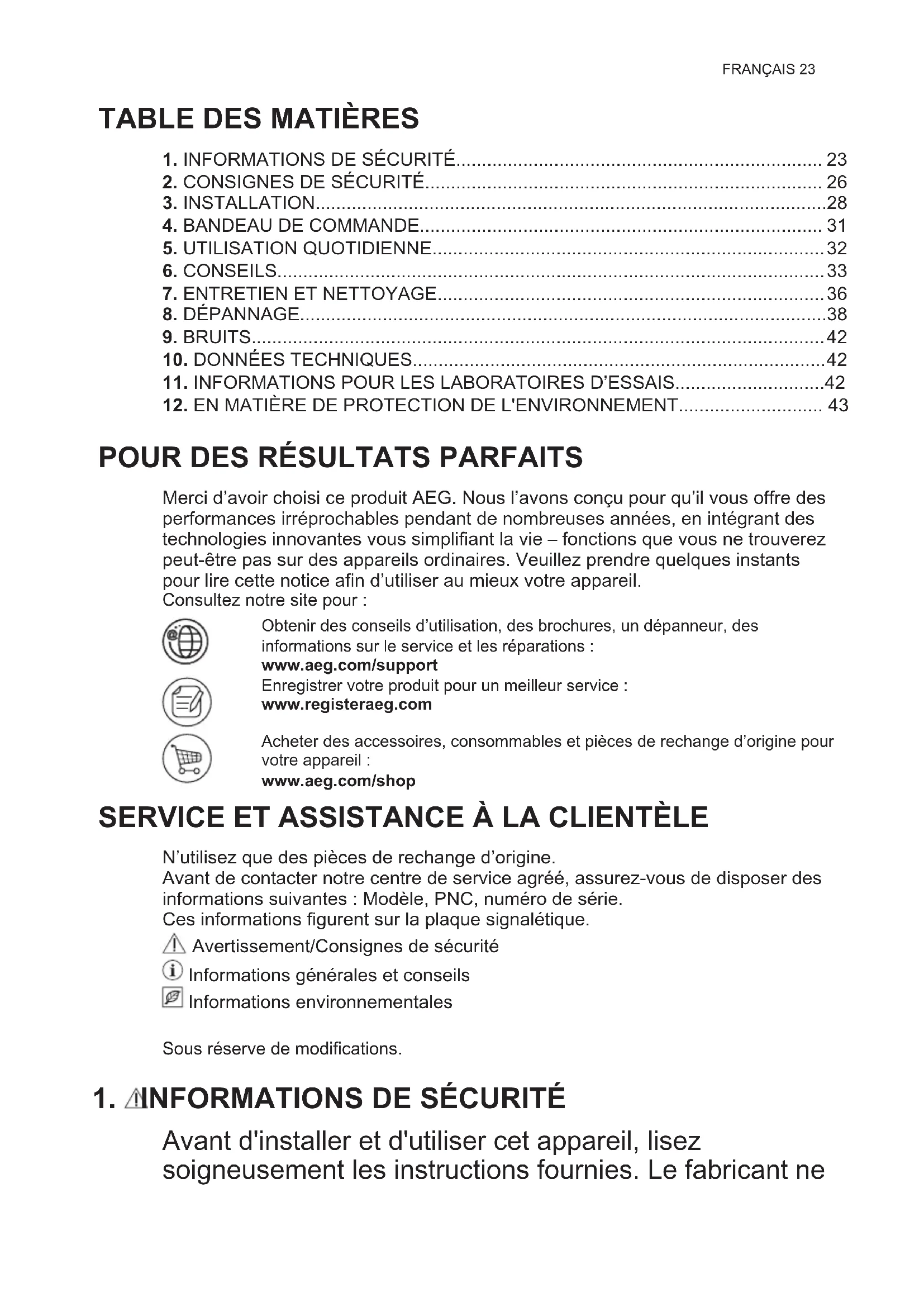 Merci d’avoir choisi ce produit AEG. Nous l’avons conçu pour qu’il vous offre des performances irréprochables pendant de nombreuses années, en intégrant des technologies innovantes vous simplifiant la vie – fonctions que vous ne trouverez peut-être pas sur des appareils ordinaires. Veuillez prendre quelques instants pour lire cette notice afin d’utiliser au mieux votre appareil. Consultez notre site pour : Obtenir des conseils d’utilisation, des brochures, un dépanneur, des informations sur le service et les réparations : www.aeg.com/support Enregistrer votre produit pour un meilleur service : www.registeraeg.com Acheter des accessoires, consommables et pièces de rechange d’origine pour votre appareil : www.aeg.com/shop