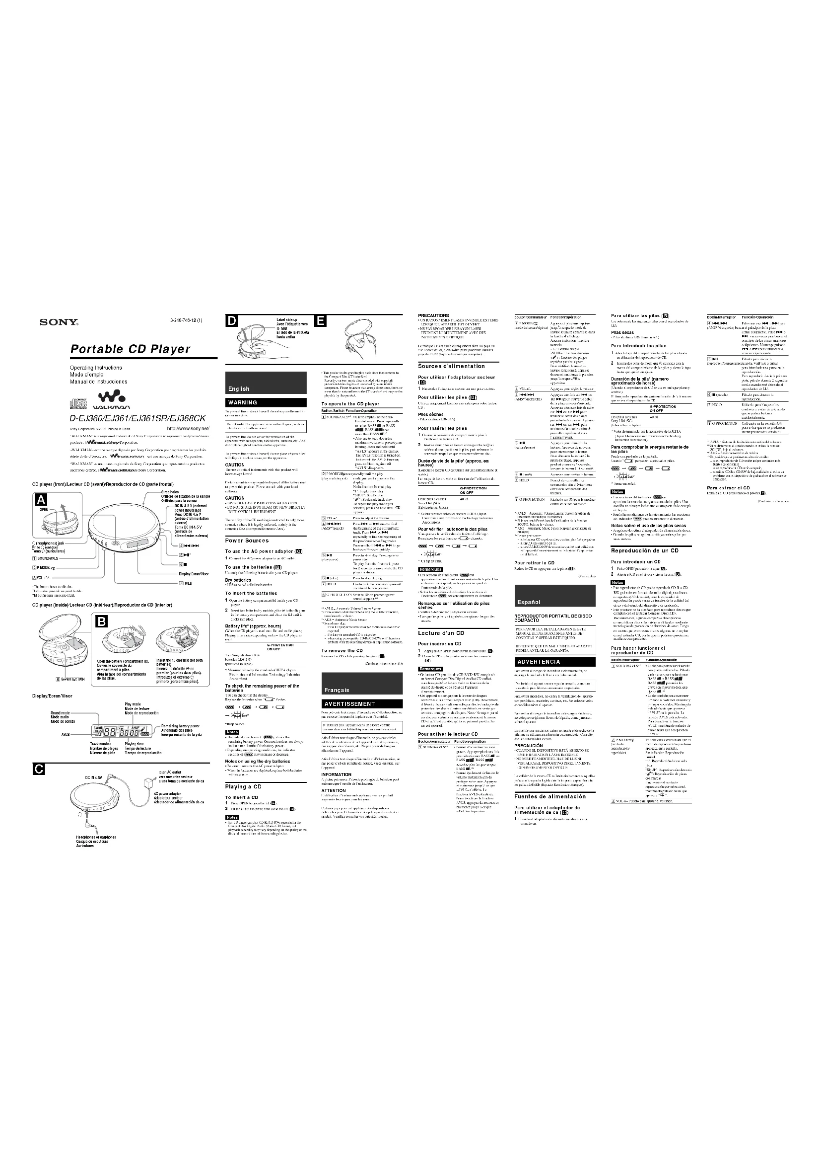 Sound may skip:– if the CD player receives stronger continuous shock thanexpected,– if a dirty or scratched CD is played or– when using poor-quality CD-Rs/CD-RWs or if there is aproblem with the recording device or application software.To remove the CDRemove the CD while pressing the pivot (E).(Continue to the reverse side)Play modeMode de lectureModo de reproducción Français AVERTISSEMENT Pour prévenir tout risque d’incendie ou d’électrocution, nepas exposer l’appareil à la pluie ou à l’humidité.N’installez pas l’appareil dans un espace confinécomme dans une bibliothèque ou un meuble encastré.Afin d’éviter tout risque d’incendie, ne pas couvrir lesailettes de ventilation de cet appareil avec des journaux,des nappes, des rideaux, etc. Ne pas poser de bougiesallumées sur l’appareil.Afin d’éviter tout risque d’incendie et d’électrocution, nepas poser d’objets remplis de liquide, vases ou autre, surl’appareil.INFORMATIONA pleine puissance, l’écoute prolongée du baladeur peutendommager l’oreille de l’utilisateur.ATTENTIONL’utilisation d’instruments optiques avec ce produitaugmente les risques pour les yeux.Certains pays peuvent appliquer des dispositionsdifférentes pour l’élimination des piles qui alimentent ceproduit. Veuillez consulter vos autorités locales.PRECAUTIONS• UN RAYONNEMENT LASER INVISIBLE EST EMISLORSQUE L’APPAREIL EST OUVERT• NE PAS REGARDER LE RAYON LASERFIXEMENT NI DIRECTEMENT AVEC DESINSTRUMENTS D’OPTIQUELa marque CE est valable uniquement dans les pays oùelle a force de loi, c’est-à-dire principalement dans lespays de l’EEE (Espace économique européen). Sources d’alimentation Pour utiliser l’adaptateur secteur(C)1 Raccordez l’adaptateur secteur sur une prise secteur.Pour utiliser les piles (B)Utilisez uniquement les piles suivantes pour votre lecteur CD : Piles sèches• Piles alcalines LR6 (AA)Pour insérer les piles1 Ouvrez le couvercle du compartiment à piles àl’intérieur du lecteur CD. 2 Insérez deux piles en faisant correspondre le 3 au schéma du compartiment à piles, puis refermez lecouvercle jusqu’à ce que vous entendiez un clic.Durée de vie de la pile* (approx. enheures)(Lorsque le lecteur CD est utilisé sur une surface plane etstable.)Le temps de lecture varie en fonction de l’utilisation dulecteur CD.G-PROTECTIONON OFFDeux piles alcalines 40 36Sony LR6 (SG)(fabriquées au Japon)* Valeur mesurée selon les normes JEITA (JapanElectronics and Information Technology IndustriesAssociation).Pour vérifier l’autonomie des pilesVous pouvez la vérifier dans la fenêtre d’affichage.Remplacez les piles lorsque «» clignote. t t t t t Lo batt** Un bip est émis.Remarques• Les sections de l’indicateur indiquentapproximativement l’autonomie restante de la pile. Unesection ne correspond pas toujours à un quart del’autonomie de la pile.• Selon les conditions d’utilisation, les sections del’indicateur peuvent augmenter ou diminuer.Remarques sur l’utilisation de pilessèches• Veillez à débrancher l’adaptateur secteur.• Lorsque les piles sont épuisées, remplacez-les par desneuves. Lecture d’un CD Pour insérer un CD 1 Appuyez sur OPEN pour ouvrir le couvercle (A). 2 Placez le CD sur le pivot et refermez le couvercle(D).Remarques• Ce lecteur CD peut lire des CD-R/CD-RW enregistrésau format Compact Disc Digital Audio (CD audio),mais la capacité de lecture varie en fonction de laqualité du disque et de l’état de l’appareild’enregistrement.• Cet appareil est conçu pour la lecture de disquesconformes à la norme Compact Disc (CD). Récemment,différents disques audio encodés par des technologies deprotection des droits d’auteur ont été mis en vente parcertaines compagnies de disques. Notez bien que, parmices disques, certains ne sont pas conformes à la normeCD et qu’il est possible qu’ils ne puissent pas être lussur cet appareil.Pour activer le lecteur CDBouton/commutateurFonction/opération1 SOUND/AVLS*