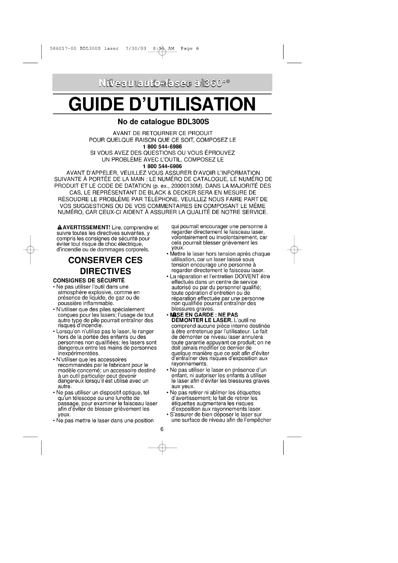 - Replace battery 586017-00 BDL300S laser 7/30/03 8:51 AM Page 5AVERTISSEMENT! Lire, comprendre et suivre toutes les directives suivantes, y compris les consignes de sécurité pour éviter tout risque de choc électrique, d’incendie ou de dommages corporels. CONSERVER CES DIRECTIVES