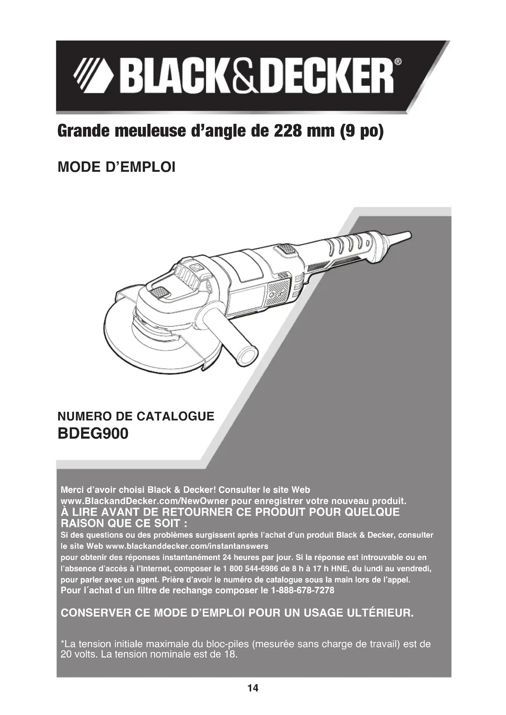 Grande meuleuse d’angle de 228 mm (9 po) Merci d’avoir choisi Black & Decker! Consulter le site Webwww.BlackandDecker.com/NewOwner pour enregistrer votre nouveau produit. À LIRE AVANT DE RETOURNER CE PRODUIT POUR QUELQUE RAISON QUE CE SOIT : Si des questions ou des problèmes surgissent après l’achat d’un produit Black & Decker, consulter le site Web www.blackanddecker.com/instantanswers pour obtenir des réponses instantanément 24 heures par jour. Si la réponse est introuvable ou en l’absence d’accès à l’Internet, composer le 1 800 544-6986 de 8 h à 17 h HNE, du lundi au vendredi,pour parler avec un agent. Prière d’avoir le numéro de catalogue sous la main lors de l’appel.Pour l´achat d´un filtre de rechange composer le 1-888-678-7278 CONSERVER CE MODE D’EMPLOI POUR UN USAGE ULTÉRIEUR. *La tension initiale maximale du bloc-piles (mesurée sans charge de travail) est de 20volts.Latensionnominaleestde18.1515 LIGNES DIRECTRICES EN MATIÈRE DE SÉCURITÉ - DÉFINITIONS Il est important que vous lisiez et compreniez ce mode d’emploi. Les informations qu’il contientconcernentVOTRESÉCURITÉetvisentàÉVITERTOUTPROBLÈME.Les symbolesci-dessousserventàvousaideràreconnaîtrecetteinformation.