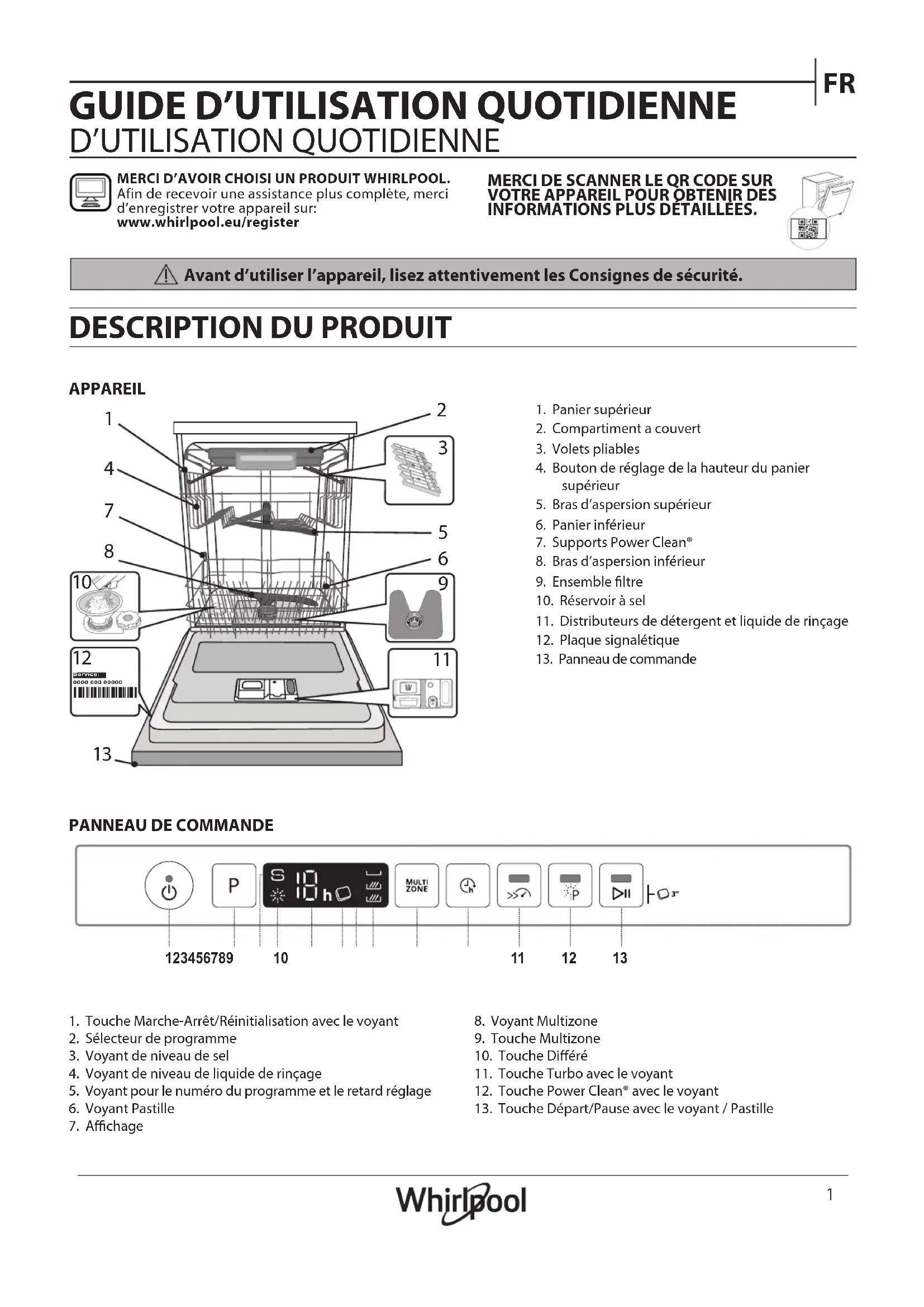 MERCI D’AVOIR CHOISI UN PRODUIT WHIRLPOOL. Afin de recevoir une assistance plus complète, merci d’enregistrer votre appareil sur: www.whirlpool.eu/register Avant d’utiliser l’appareil, lisez attentivement les Consignes de sécurité. MERCI DE SCANNER LE QR CODE SUR VOTRE APPAREIL POUR OBTENIR DES INFORMATIONS PLUS DÉTAILLÉES.2
