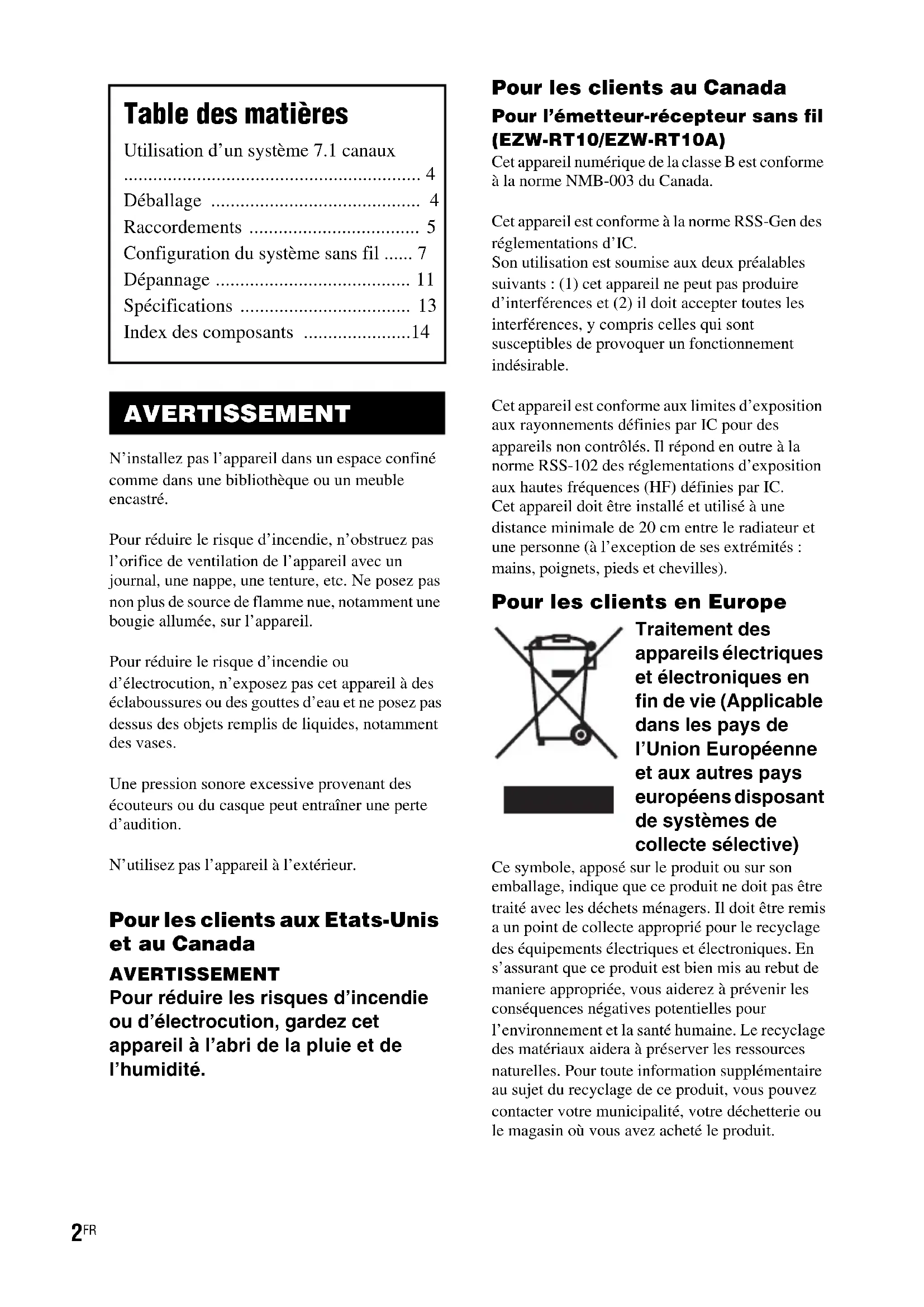 N’installez pas l’appareil dans un espace confiné comme dans une bibliothèque ou un meuble encastré.Pour réduire le risque d’incendie, n’obstruez pas l’orifice de ventilation de l’appareil avec un journal, une nappe, une tenture, etc. Ne posez pas non plus de source de flamme nue, notamment une bougie allumée, sur l’appareil.Pour réduire le risque d’incendie ou d’électrocution, n’exposez pas cet appareil à des éclaboussures ou des gouttes d’eau et ne posez pas dessus des objets remplis de liquides, notamment des vases.Une pression sonore excessive provenant des écouteurs ou du casque peut entraîner une perte d’audition.N’utilisez pas l’appareil à l’extérieur. Pour les clients aux Etats-Unis et au Canada AVERTISSEMENT Pour réduire les risques d’incendie ou d’électrocution, gardez cet appareil à l’abri de la pluie et de l’humidité. Pour les clients au Canada Pour l’émetteur-récepteur sans fil (EZW-RT10/EZW-RT10A) Cet appareil numérique de la classe B est conforme à la norme NMB-003 du Canada.Cet appareil est conforme à la norme RSS-Gen des réglementations d’IC. Son utilisation est soumise aux deux préalables suivants : (1) cet appareil ne peut pas produire d’interférences et (2) il doit accepter toutes les interférences, y compris celles qui sont susceptibles de provoquer un fonctionnement indésirable.Cet appareil est conforme aux limites d’exposition aux rayonnements définies par IC pour des appareils non contrôlés. Il répond en outre à la norme RSS-102 des réglementations d’exposition aux hautes fréquences (HF) définies par IC. Cet appareil doit être installé et utilisé à une distance minimale de 20 cm entre le radiateur et une personne (à l’exception de ses extrémités : mains, poignets, pieds et chevilles). Pour les clients en Europe Traitement des appareils électriques et électroniques en fin de vie (Applicable dans les pays de l’Union Européenne et aux autres pays européens disposant de systèmes de collecte sélective) Ce symbole, apposé sur le produit ou sur son emballage, indique que ce produit ne doit pas être traité avec les déchets ménagers. Il doit être remis a un point de collecte approprié pour le recyclage des équipements électriques et électroniques. En s’assurant que ce produit est bien mis au rebut de maniere appropriée, vous aiderez à prévenir les conséquences négatives potentielles pour l’environnement et la santé humaine. Le recyclage des matériaux aidera à préserver les ressources naturelles. Pour toute information supplémentaire au sujet du recyclage de ce produit, vous pouvez contacter votre municipalité, votre déchetterie ou le magasin où vous avez acheté le produit. Table des matières Utilisation d’un système 7.1 canaux