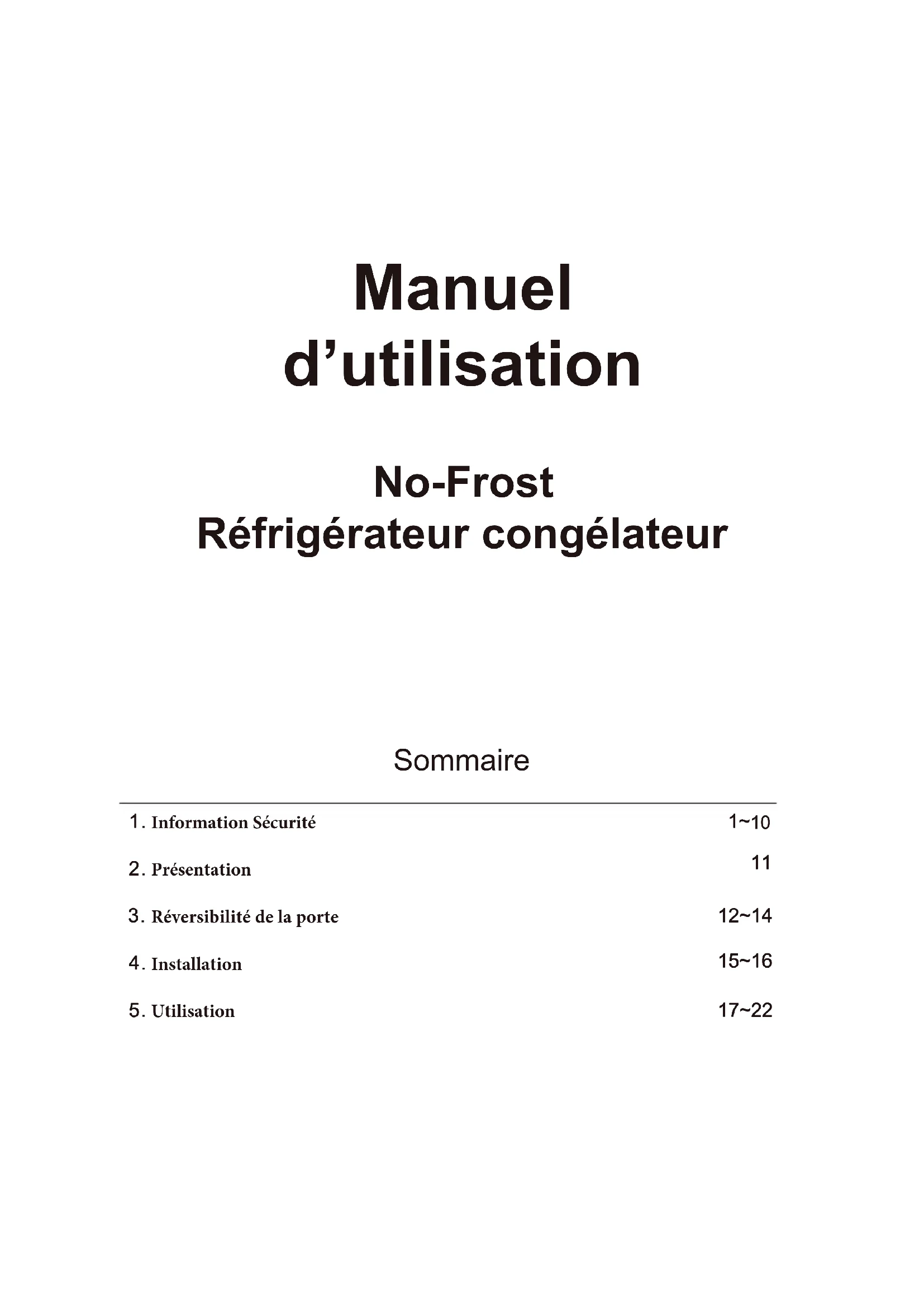 12~14 15~16 17~22 Manuel d’utilisation No-Frost Réfrigérateur congélateurNous vous remercions d'avoir acheté ce produit. Avant d'utiliser votre réfrigérateur, veuillez lire attentivement ces instructions d'utilisation afin de maximiser ses performances. Conservez cette documentation pour pouvoir vous y référer ultérieurement ou pour les éventuels futurs propriétaires. Ce produit est destiné uniquement à un usage domestique ou autres usages similaires tels que : - l'espace cuisine réservé au personnel dans un magasin, des bureaux ou autres lieux de travail, - dans les fermes-auberges, pour la clientèle des hôtels, motels et autres lieux de type résidentiel, - dans les chambres d'hôtes, - chez la restauration et autres services similaires, ce produit ne convient pas à la vente au détail. Cet ap pareil doit être utilisé uniquement pour conserver de la nourriture ; tout autre usage est considéré comme dangereux et le fabricant ne sera pas tenu responsable en cas de mauvaise utilisation. Il est donc recommandé de prendre connaissance des conditions de garantie.