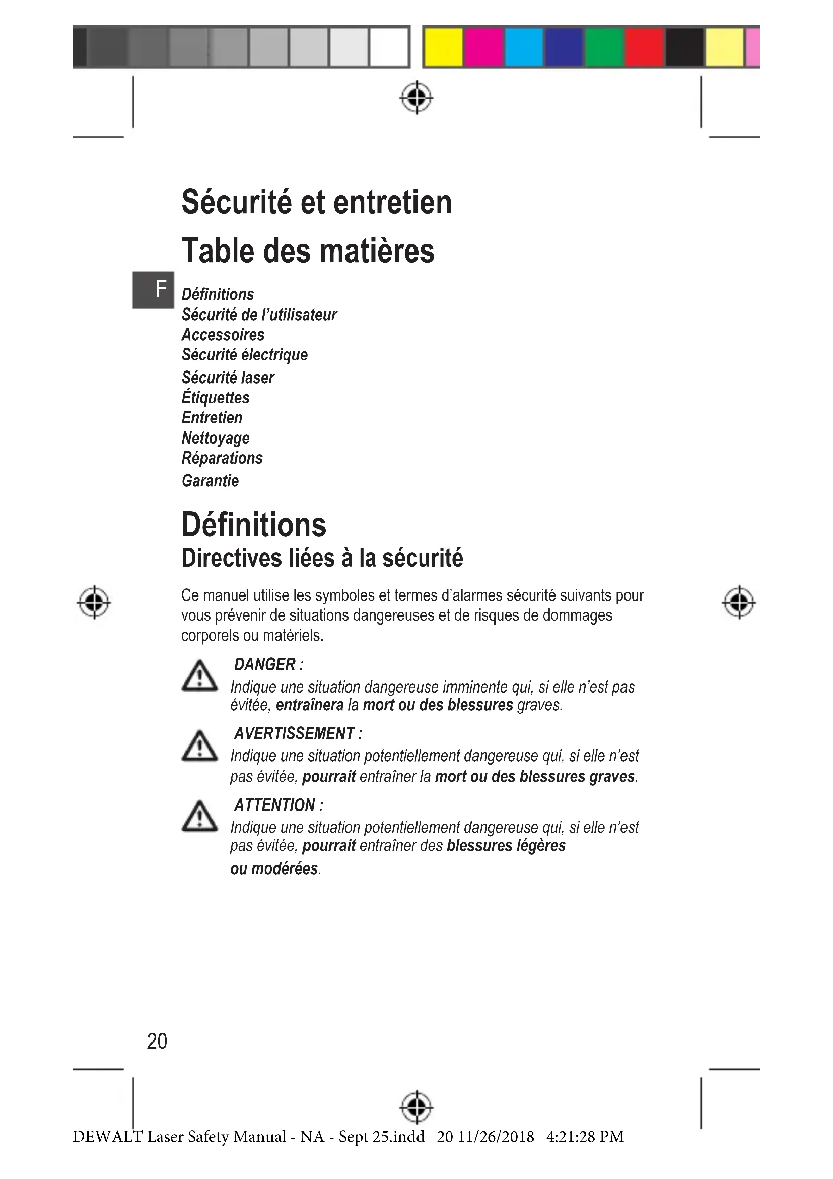 Indique une situation potentiellement dangereuse qui, si elle n’est pas évitée, pourrait entraîner la mort ou des blessures graves. ATTENTION : Indique une situation potentiellement dangereuse qui, si elle n’est pas évitée, pourrait entraîner des blessures légères ou modérées. DEWALT Laser Safety Manual - NA - Sept 25.indd 20 11/26/2018 4:21:28 PMF