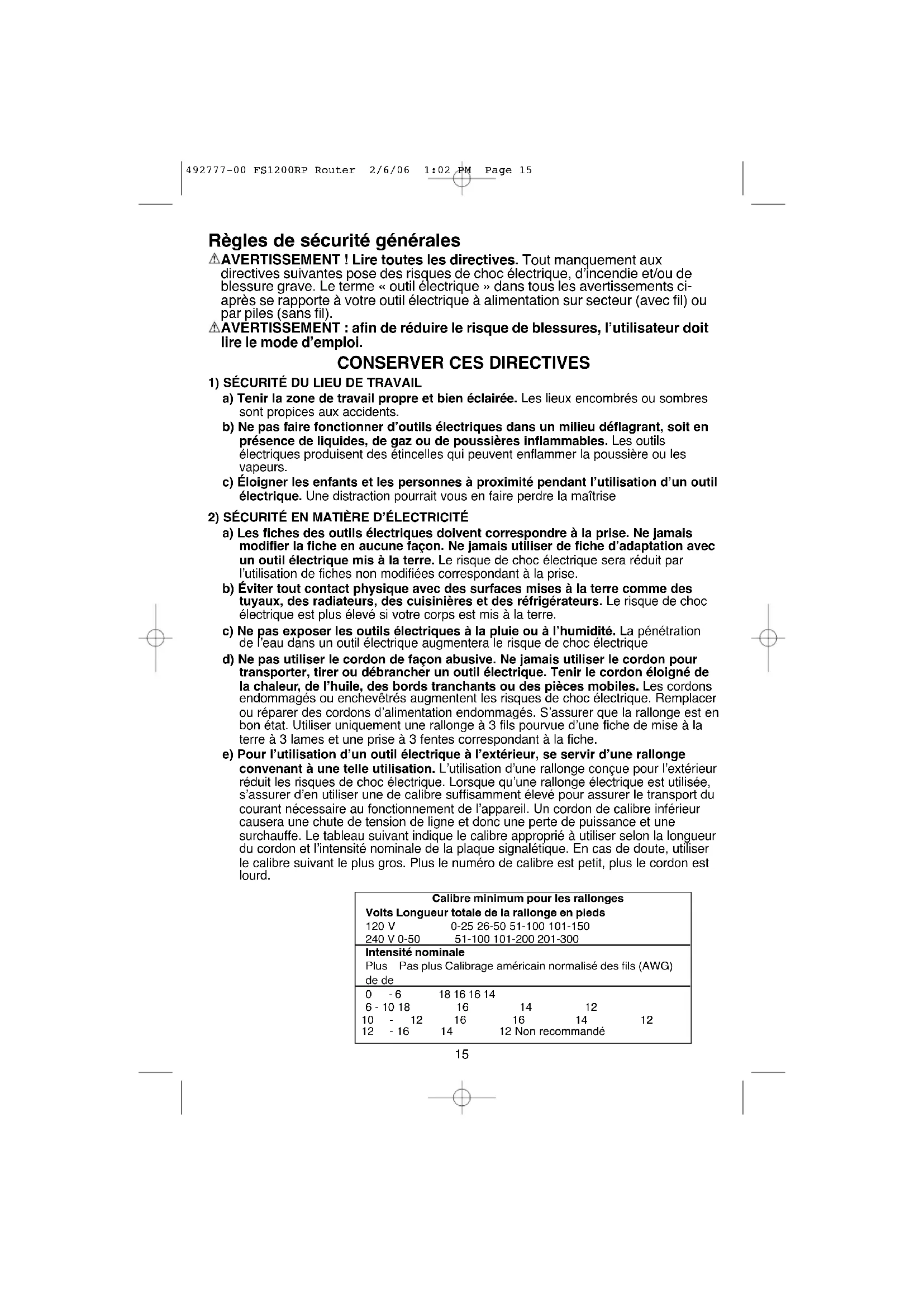 492777-00 FS1200RP Router 2/6/06 1:02 PM Page 1415 Règles de sécurité générales AVERTISSEMENT ! Lire toutes les directives. Tout manquement aux directives suivantes pose des risques de choc électrique, d’incendie et/ou de blessure grave. Le terme « outil électrique » dans tous les avertissements ci- après se rapporte à votre outil électrique à alimentation sur secteur (avec fil) ou par piles (sans fil).