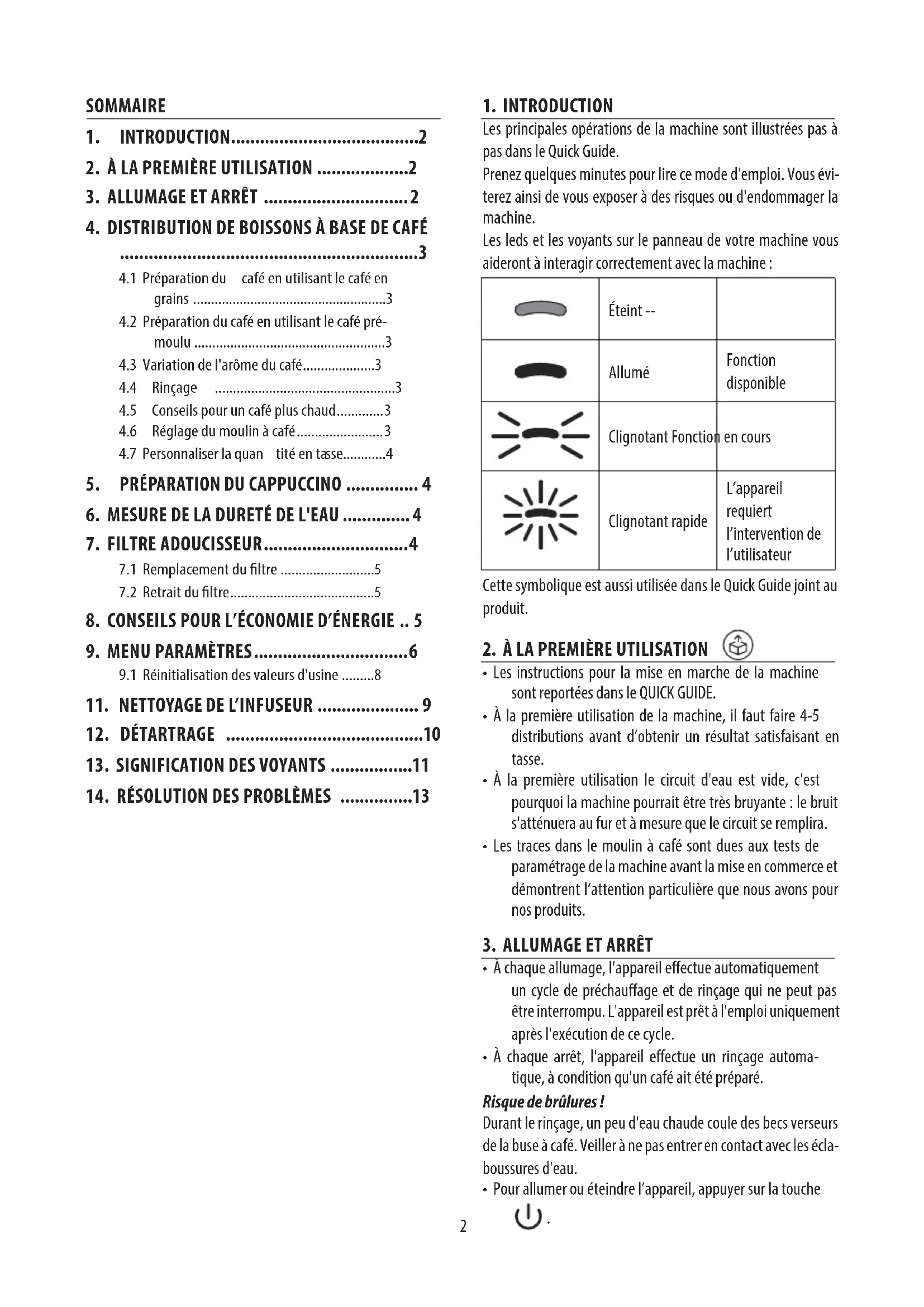 Voyant Description Les voyants relatifs aux bois- sons clignotent La machine est en train de chauer: attendre Les voyants relatifs aux bois- sons et à leurs paramétrages sont allumés xes La machine est prête à l’em- ploi: sélectionner la boisson à préparer et les options correspondantes Remplacer le ltre (voir chapitre « 7. Filtre adoucisseur»)