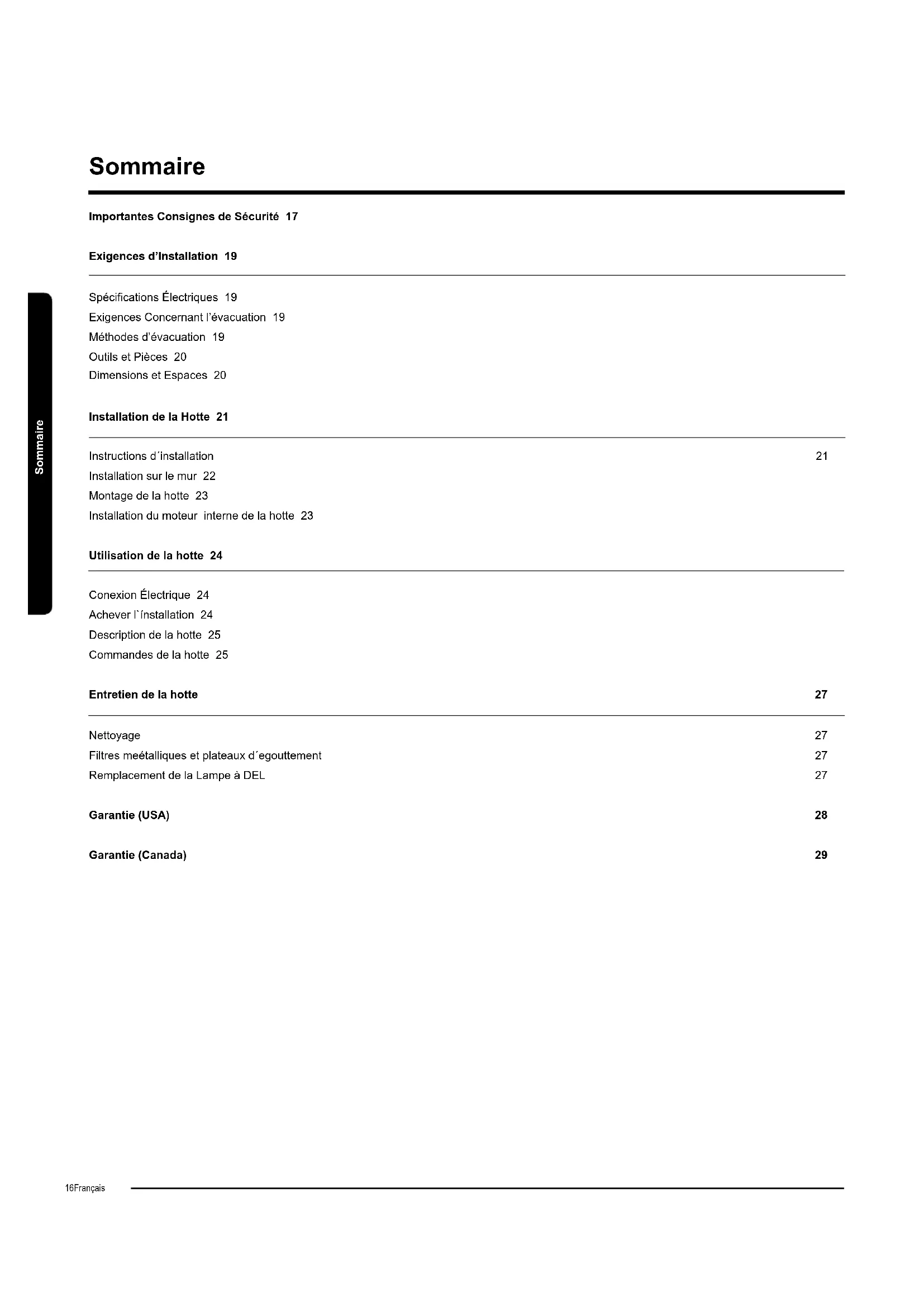 - Consulter un professionnel de HVAC pour sélectionner la hotte avec la capacité de CFM correcte pour votre application. La capacité de CFM dépend de la classication de BTU del poêle, la taille et l’emplacement, la taille de la cuisine et les conduits de la hotte.Français 27 Entretien de la Hotte Nettoyage Surfaces externes: An d’éviter d’endommager la surface externe, ne pas utiliser de tampons en laine d’acier ou de tampons à récurer savonneux. Ne pas utiliser de nettoyants à base de chlore. Frotter dans la direction des lignes du grain pour ne pas détériorer la surface. Toujours essuyer pour éviter de laisser des marques d’eau.