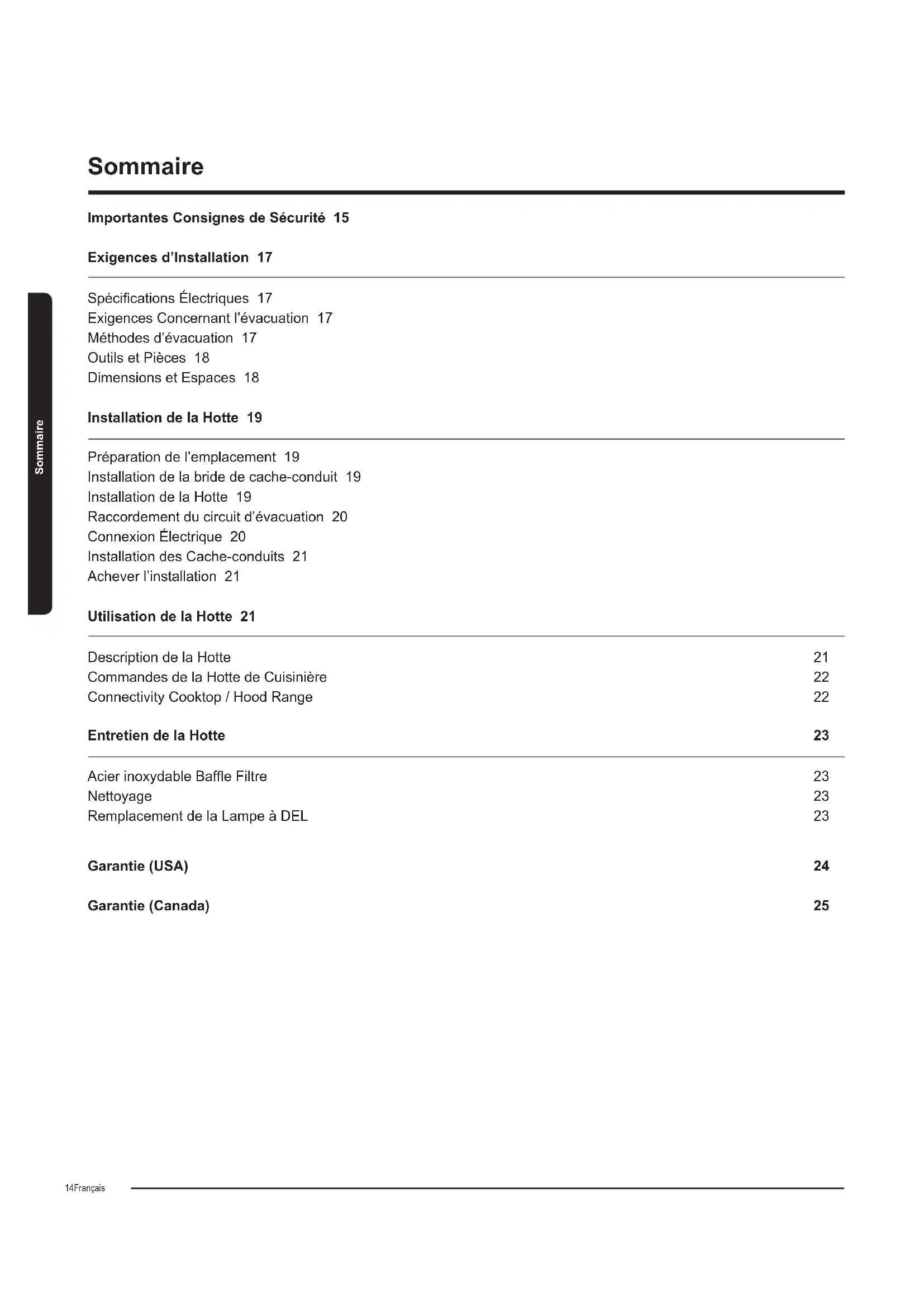 Pousser le ltre vers le haut et relâcher la poignée pour l’emboîter. AVERTISSEMENT Lors du retrait du ltre, s’il vous plaît le tenir avec les deux mains pour vous assurer qu’il ne tombe pas. Remplacement de la Lampe à DEL Les lumières DEL sont remplaçables par un technicien de service seule- ment. Voir les informations de contact de service à la page de Garantie. Entretien de la Hottegarantie (USA) HOTTE SAMSUNG Garantie limitée à l’acheteur d’origine Ce produit de la marque SAMSUNG, qui est fourni et distribué par la société Samsung Electronics America, Inc. (SAMSUNG) et livré neuf, dans son carton d’origine à l’acheteur d’origine, est garanti par Samsung contre les défauts de fabrication à la fois dans les matériaux et de fabrication pour une période de garantie limitée de: UN (1) AN PIECES ET MAIN D’ŒUVRE Cette garantie limitée commence à la date d’achat originale, et est valable uniquement sur les produits achetés et utilisés aux Etats-Unis. An de bénécier du service de garantie, l’acheteur doit contacter SAMSUNG pour la détermination du problème et connaître les procédures de service. Le service garantie ne peut être effectué que par un centre de service SAMSUNG agréé. Le projet de loi original date de vente doit être présenté sur de- mande comme preuve d’achat à SAMSUNG ou dans un centre de service SAMSUNG autorisé. SAMSUNG réparera ou remplacera ce produit, à notre gré et sans frais comme stipulé ici, avec des pièces ou des produits neufs ou reconditionnés si ils sont jugés défectueux pendant la période de garantie limitée spéciée ci-dessus. Toutes les pièces et les produits remplacés deviennent la propriété de SAMSUNG et doivent être retournés à SAMSUNG. Les pièces et produits de rechange reprennent la garantie d’origine ou quatre-vingt-dix (90) jours, la plus longue des deux étant la valable. Le service à domicile sera assuré pendant la période de travail de garantie sous réserve de disponibilité dans les Etats-Unis. Le service à domicile n’est pas disponible dans tous les domaines. Pour recevoir le service à domicile, le produit doit être non bloqué et accessible au personnel. Si au cours de la réparation à domicile cela ne peut être possible, il peut être nécessaire d’enlever, réparer et de retourner (renvoyer) le produit. Cette garantie limitée couvre les défauts de fabrication des matériaux et de fabrication rencontrés dans l’utilisation non commerciale normale de ce produit et ne sont pas applicables à celui-ci, y compris, mais pas limiter : aux dommages qui se produisent lors de l’expédition ; la livraison et l’installation ; les applications et utilisations pour lesquelles ce produit n’est pas prévu : modie les produits ou numéros de série ; les dommages esthétiques ou nition extérieure ; accidents ; abus ; négligences ; le feu ; l’eau ; la foudre ; et d’autres actes qui émanent de la nature ; utilisation des produits, équipements, systèmes, ser- vices publics, services, pièces, fournitures, accessoires, applica- tions, installations, réparations, câblage externe ou connecteurs non fournis ou autorisés par SAMSUNG qui endommagent ce produit ou peut entraîner des problèmes d’utilisation ; incorrecte tension de la ligne électrique, les uctuations et les surtensions ; ajustement fait par les clients et le non-respect des instructions d’utilisation, le nettoyage, l’entretien, et les instructions de l’envi- ronnement qui sont couverts et prescrits dans le livre d’instruc- tion ; les problèmes causés par les infestations de ravageurs, et la surchauffe par l’utilisateur. IL N’Y A AUCUNE GARANTIE EXPRESSE AUTRE QUE CELLE FIGURANT CI-DESSUS ET AUCUNE GARANTIE EXPLICITE OU IMPLICITE, Y COMPRIS, MAIS PAS LIMITER, TOUTE GARAN- TIE IMPLICITE DE QUALITE MARCHANDE OU D’ADAPTATION A UN USAGE PARTICULIER, SONT APPLICABLES APRES LA PERIODE EXPRESSE DE GARANTIE DONNEE PAR TOUTE PERSONNE ENTREPRISE OU SOCIETE EN MATIERE DE CE PRODUIT EST OBLIGATOIRE SUR SAMSUNG. SAMSUNG NE SERA PAS RESPONSABLE POUR LA PERTE DE REVENUS OU DE PROFITS DEFAUT DE REALISER DES ECONOMIES OU AUTRES AVANTAGES OU TOUT AUTRE DOMMAGES SPE- CIAUX, DIRECTS OU INDIRECTS CAUSES PAR L’UTILISATION, MAUVAISE UTILISATION OU L’INCAPACITE D’UTILISER CE PRODUIT QUELLE QUE SOITLA THEORIE JURIDIQUE SUR LAQUELLE LA RECLAMATION REPOSE, ET MEME SI SAM- SUNG A ETE AVERTI DE LA POSSIBILITE DE TELS DOMMAG- ES. NI DE RECUPERATION DE QUELQUE NATURE QUE CON- TRE SAMSUNG NE SERA SUPERIEUR AU MONTANT DU PRIX D’ACHAT DU PRODUIT VENDU PAR SAMSUNG ET CAUSER LE DOMMAGE ALLEGUE. SANS LIMITER CE QUI PRECEDE, L’ACHETEUR ASSUME TOUS LES RISQUES ET RESPONS- ABILITES POUR LES PERTES, DOMMAGES OU BLESSURES POUR L’ACHETEUR ET LES BIENS DE L’ACHETEUR ET AUX AUTRES ET DE LEURS BIENS PROVENANT DE L’UTILISATION MAUVAISE UTILISATION OU L’INCAPACITE D’UTILISER CE PRODUIT VENDU PAR SAMSUNG QUI NE SOIT PAS DIRECTE- MENT CAUSES PAR LA NEGLIGENCE DE SAMSUNG. CETTE GARANTIE LIMITEE NE S’ETEND A PERSONNE D’AUTRE QUE L’ACHETEUR D’ORIGINE DE CE PRODUIT ET EST NON TRANSFERABLE ET EST VOTRE RECOURS EXCLUSIF. Certaines provinces ou territoires peuvent ou peuvent ne pas permettre de limiter la durée d’une garantie implicite ou l’exclu- sion ou la limitation des dommages indirects ou consécutifs, les limitations ou exclusions ci-dessus peuvent ne pas vous concerner. Cette garantie vous donne des droits spéciques légaux, et vous pouvez avoir d’autres droits qui varient d’un Etat à l’autre. Pour obtenir un service de garantie, s’il vous plaît contactez SAMSUNG à: 1-800-SAMSUNG (726-7864) ou www.samsung.com/us/supportgarantie (Canada) HOTTE SAMSUNG Garantie limitée à l’acheteur d’origine Ce produit de la marque SAMSUNG, qui est fourni et distribué par la société Samsung Electronics Canada, Inc. (SAMSUNG) et livré neuf, dans son carton d’origine à l’acheteur d