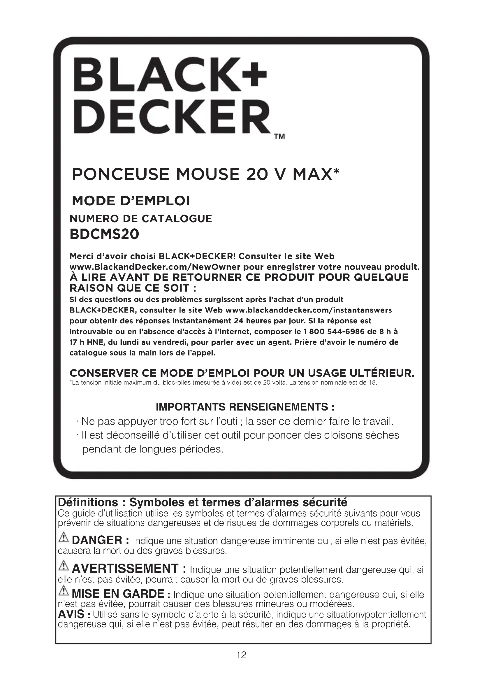 Merci d’avoir choisi BLACK+DECKER! Consulter le site Web www.BlackandDecker.com/NewOwner pour enregistrer votre nouveau produit.ÀLIRE AVANT DE RETOURNER CE PRODUIT POUR QUELQUE RAISON QUE CE SOIT :Si des questions ou des problèmes surgissent après l’achat d’un produit BLACK+DECKER, consulter le site Web www.blackanddecker.com/instantanswers pour obtenir des réponses instantanément 24 heures par jour. Si la réponse est introuvable ou en l’absence d’accès à l’Internet, composer le 1 800 544-6986 de 8 h à 17 h HNE, du lundi au vendredi, pour parler avec un agent. Prière d’avoir le numéro de catalogue sous la main lors de l’appel.CONSERVER CE MODE D’EMPLOI POUR UN USAGE ULTÉRIEUR.*La tension initiale maximum du bloc-piles (mesurée à vide) est de 20 volts. La tension nominale est de 18.NUMERO DE CATALOGUE BDCMS20Avertissements de sécurité généraux pour les outils électriques AVERTISSEMENT! Lire tous les avertissements de sécurité et toutes les directives. Le non-respect des avertissements et des directives pourrait se solder par un choc électrique, un incendie et/ou une blessure grave. Conserver tous les avertissements et toutes les directives pour un usage ultérieur. Le terme «outil électrique» cité dans les avertissements se rapporte à votre outil électrique à alimentation sur secteur (avec fil) ou par piles (sans fil).
