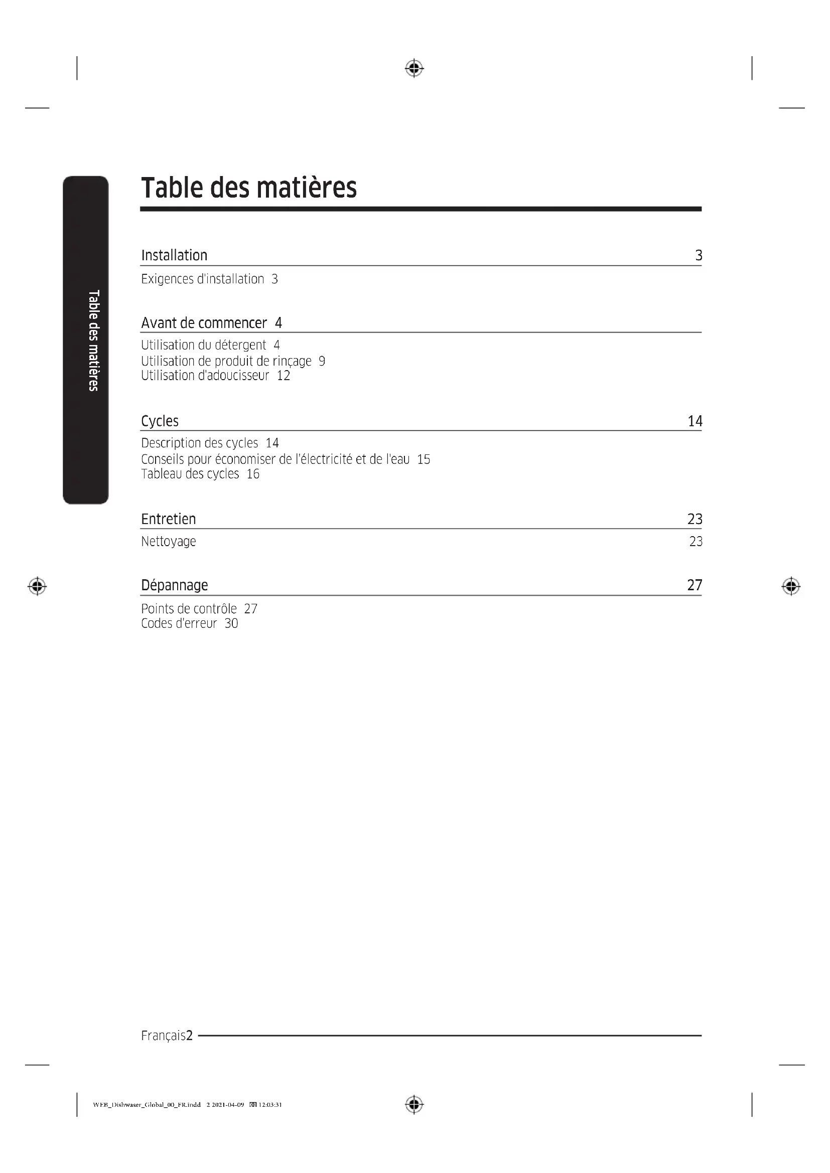 - (opłata według taryfy operatora) http://www.samsung.com/pl/support/ HUNGARY 0680SAMSUNG (0680-726-7864) www.samsung.com/hu/support CROATIA 072 726 786 www.samsung.com/hr/support ALBANIA 045 620 202 www.samsung.com/al/support North Macedonia 023 207 777 www.samsung.com/mk/support SLOVENIA 080 697 267 (brezplačna številka) www.samsung.com/si/support BOSNIA 055 233 999 www.samsung.com/ba/support ESTONIA 800-7267 www.samsung.com/ee/support LITHUANIA 8-800-77777 www.samsung.com/lt/support LATVIA 8000-7267 www.samsung.com/lv/support WEB_Dishwaser_Global_00_EN.indd 32 2021-04-09 12:01:13Lave-vaisselle Guide d’écoconception WEB_Dishwaser_Global_00_FR.indd 1 2021-04-09 12:03:31Français2 Table des matières Table des matières Installation 3 Exigences d'installation 3 Avant de commencer 4 Utilisation du détergent 4 Utilisation de produit de rinçage 9 Utilisation d'adoucisseur 12 Cycles 14 Description des cycles 14 Conseils pour économiser de l'électricité et de l'eau 15 Tableau des cycles 16 Entretien 23 Nettoyage 23 Dépannage 27 Points de contrôle 27 Codes d'erreur 30 WEB_Dishwaser_Global_00_FR.indd 2 2021-04-09 12:03:31Français 3 Installation Installation Exigences d'installation An d'éviter tout risque d'incendie, d'électrocution ou de blessure, tout le câblage et le système de mise à la terre doivent être effectués par un technicien qualié. Alimentation électrique