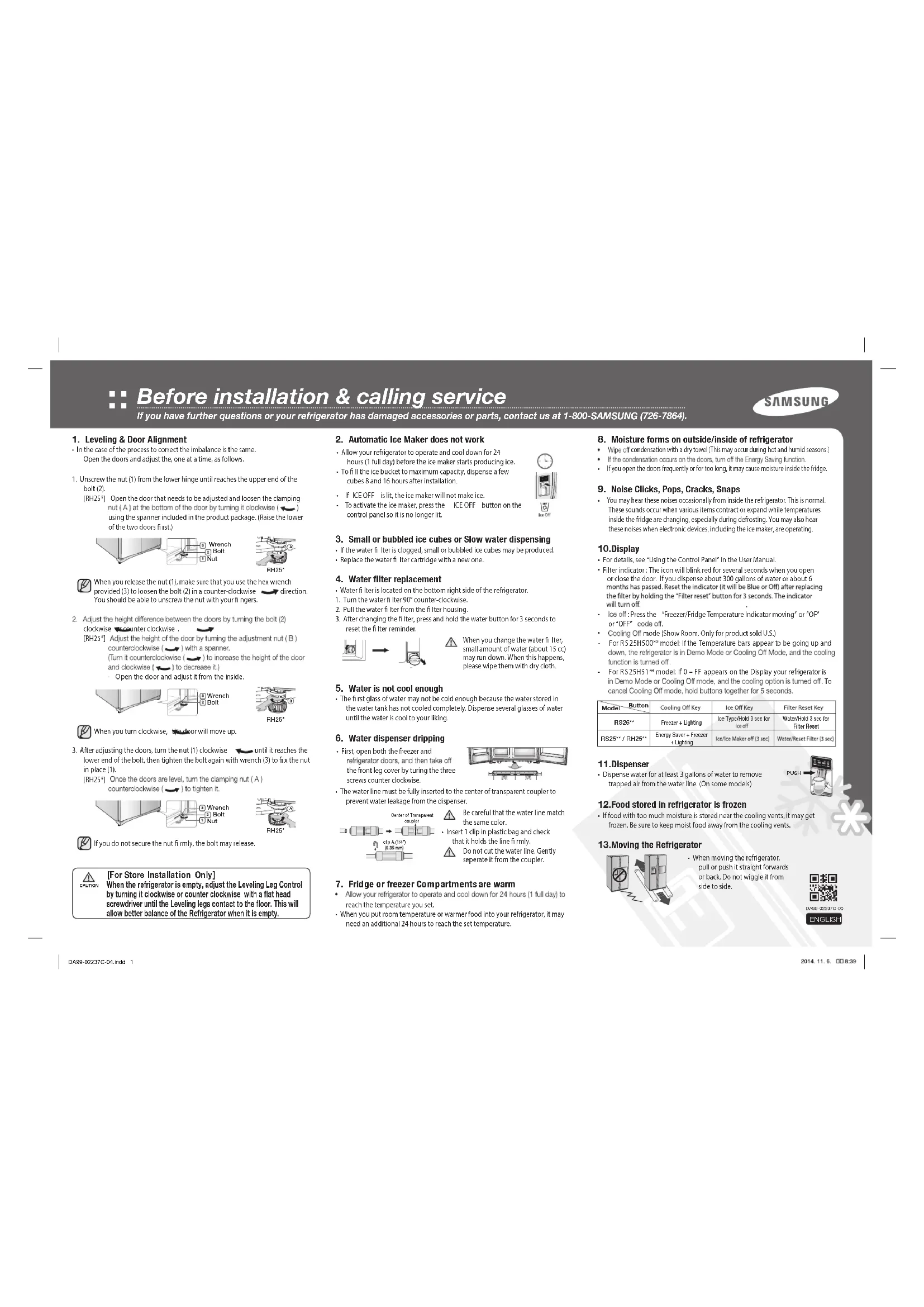- Lors du déplacement du réfrigérateur, tirez-le et poussez-le droit vers l'avant ou vers l'arrière. Ne le basculez pas d'un côté à l'autre. Avant l'installation ou un appel de service Si vous avez des questions ou si des pièces du réfrigérateur sont endommagées, contactez nous au 1-800-SAMSUNG (726-7864). FRANÇAIS DA99-02237C-04.indd 2