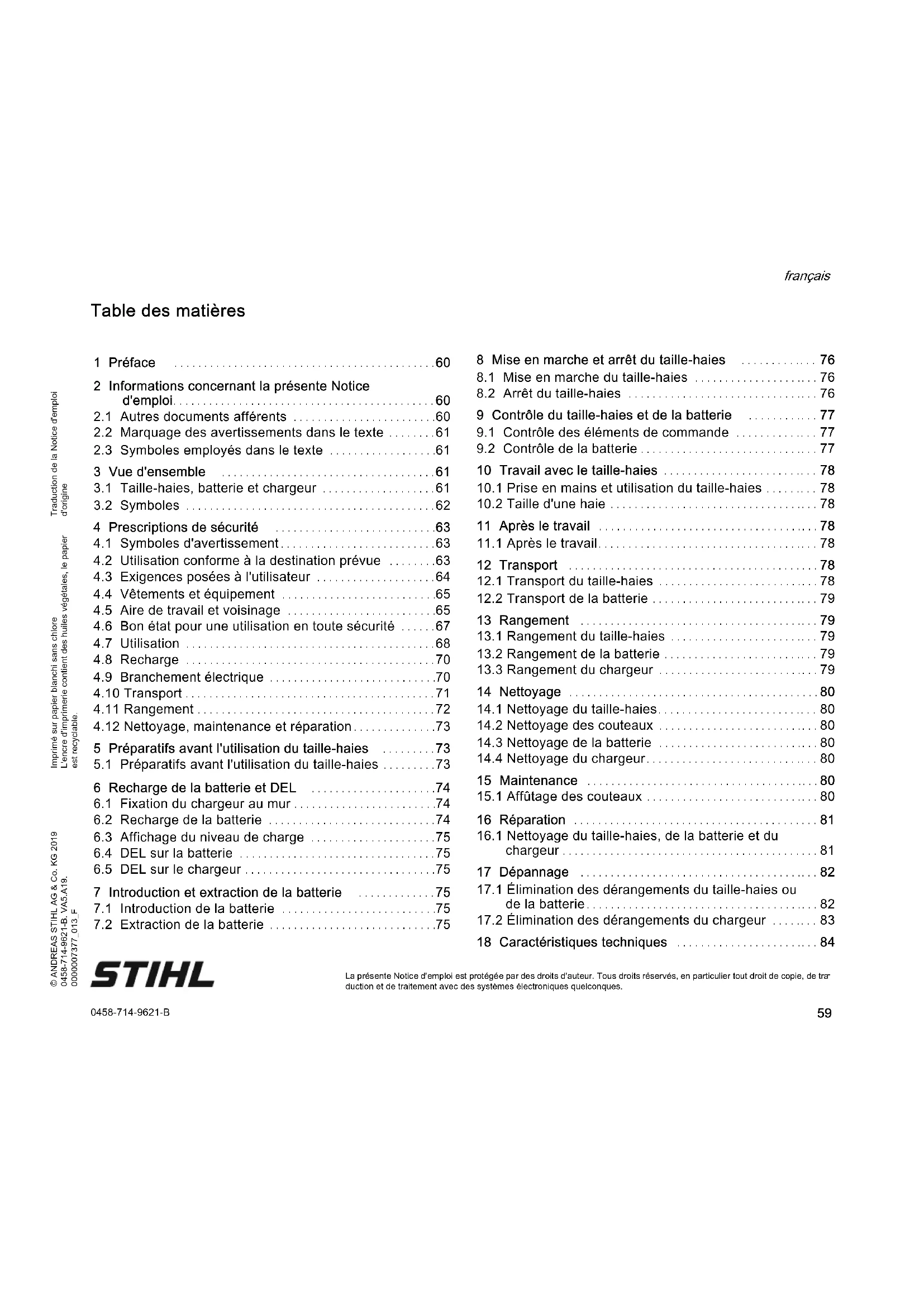 Chaque fois, avant de commencer le travail, il faut effectuer les opérations suivantes :► S'assurer que les composants suivants se trouvent dans l'état impeccable requis pour la sécurité :– Taille-haies, @ 4.6.1.– Couteaux, @ 4.6.2.– Batterie, @ 4.6.3.– Chargeur, @ 4.6.4.► Contrôler la batterie, @ 9.2.► Retirer la batterie. 5 Préparatifs avant l'utilisation du taille- haies0458-714-9621-B français 6 Recharge de la batterie et DEL► Recharger complètement la batterie, @ 6.2.► Nettoyer le taille-haies, @ 14.1.► Contrôler les éléments de commande, @ 9.1.► Si au cours du contrôle des éléments de commande 3 DEL clignotent de couleur rouge : retirer la batterie et consulter un revendeur spécialisé STIHL.Il y a un dérangement dans le taille-haies.► Si ces opérations ne peuvent pas être exécutées : ne pas utiliser le taille-haies, mais consulter un revendeur spécialisé STIHL.