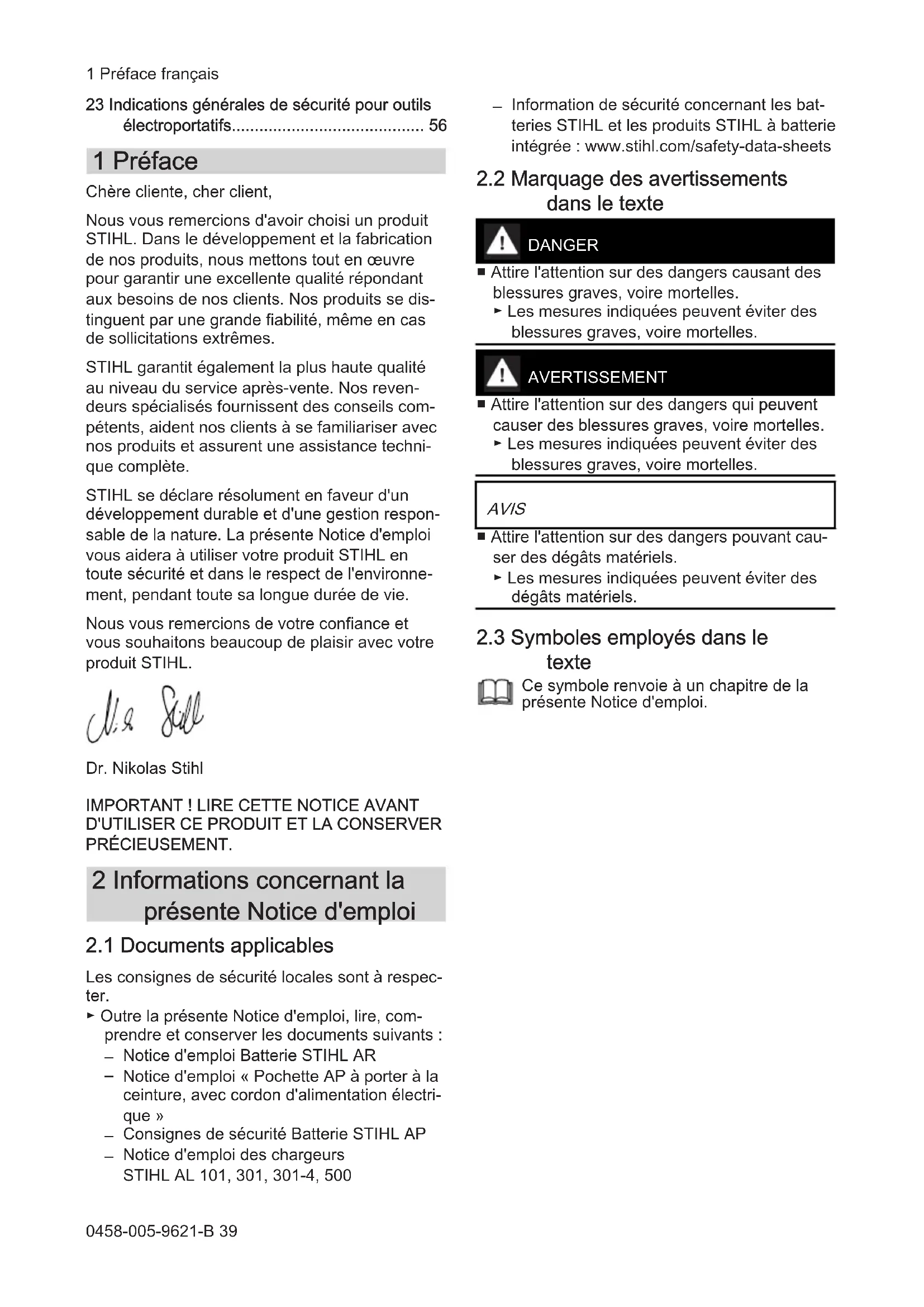 - français 38 0458-005-9621-B © ANDREAS STIHL AG & Co. KG 2022 0458-005-9621-B. VA1.E22. Imprimé sur papier blanchi sans chlore L'encre d'imprimerie contient des huiles végétales, le papier est recyclable. Traduction de la Notice d'emploi d'origine 0000009299_006_F23 Indications générales de sécurité pour outils électroportatifs 1 Préface Chère cliente, cher client, Nous vous remercions d'avoir choisi un produit STIHL. Dans le développement et la fabrication de nos produits, nous mettons tout en œuvre pour garantir une excellente qualité répondant aux besoins de nos clients. Nos produits se dis‐ tinguent par une grande fiabilité, même en cas de sollicitations extrêmes. STIHL garantit également la plus haute qualité au niveau du service après-vente. Nos reven‐ deurs spécialisés fournissent des conseils com‐ pétents, aident nos clients à se familiariser avec nos produits et assurent une assistance techni‐ que complète. STIHL se déclare résolument en faveur d'un développement durable et d'une gestion respon‐ sable de la nature. La présente Notice d'emploi vous aidera à utiliser votre produit STIHL en toute sécurité et dans le respect de l'environne‐ ment, pendant toute sa longue durée de vie. Nous vous remercions de votre confiance et vous souhaitons beaucoup de plaisir avec votre produit STIHL. Dr. Nikolas Stihl p. 56