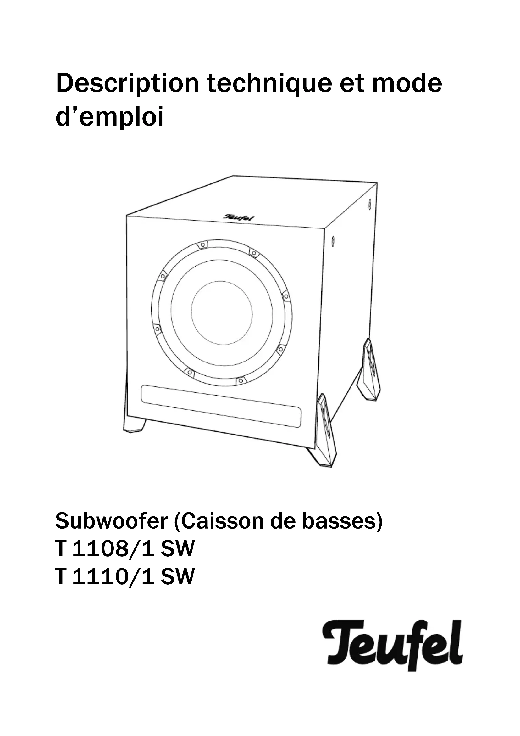 médias audio et vidéo. (13) (12) (7) (9) (11)13 • Subwoofer T8/T10 Affichages LED LED Voyant Signification STATUS (6) éclairage bleu Connexion radio au récepteur établie. clignote lente- ment en bleu L’appareil tente d’établir une connexion radio à un récepteur connu. clignote rapide- ment en bleu L’appareil est en mode couplage (pairing) et recherche un récepteur prêt pour le couplage. CLIP (7) flash rouge Entrée surchargée, niveau de signal trop élevé. POWER (8) éclairage vert L’appareil est connecté. éclairage rouge L’appareil est en veille (stand-by). (6) (7) (8)14 • Subwoofer T8/T10 Troubleshooting Les remarques suivantes devraient vous aider à éviter les problèmes. Si cela ne suffisait pas, vous trouverez certainement de l’aide dans notre manuel en ligne: http://teufelaudio.fr Dysfonctionne- ment Cause possible/solution La LED POWER(8) du caisson de basses ne s’al- lume pas. Assurez-vous que l’alimentation électrique est assurée. Véri- fiez que le câble d’alimentation est branché solidement dans la prise. Le caisson de basses ne s’éteint pas automatique- ment. Placez l’interrupteur POWER (9) sur «Auto». Fonctionnement via connexion par câble: Larestitution du son est mauvaise. Le câble audio entre le récepteur AV et le caisson de basses est trop long et/ou l’isolation n’est pas suffisante. Utilisez si possible un câble RCA court, bien blindé, ou alors la connexion sans fil. Connexion sans fil: La trans- mission est perturbée. D’autres sources radio (téléphones sans fil, stations WLAN ou appareils micro-ondes) influent sur la liaison. Changez les appareils perturbateurs de place.15 • Subwoofer T8/T10 Données techniques Caisson de basses T1108/1SW Tension de service 220–240V~/50Hz Puissance absorbée max. 125W Dimensions avec pieds (l×h×p) «downfire» 311×423×330mm (l×h×p) «frontfire» 311×373×380mm Poids 11,5kg Caisson de basses T1110/1SW Tension de service 220–240V~/50Hz Puissance absorbée max. 200W Dimensions avec pieds (l×h×p) «downfire» 351×483×380mm (l×h×p) «frontfire» 351×423×440mm Poids 15,6kg Dans ce produit sont utilisées les bandes de radiofréquence et les puissances d’émission radio suivantes: Réseau radio Bandes de radiofréquences Puissance de transmission max. Avnera 2405,35–2477,35 Mhz 1/0 mW/dBm Vous trouverez d’autres données techniques sur votre article sur notre site Internet.16 • Subwoofer T8/T10 Déclaration de conformité La société Lautsprecher Teufel GmbH déclare que ce produit est conforme à la directive 2014/53/UE. Vous trouverez le texte intégral de la déclaration de conformité UE à ces adresses Internet: www.teufel.de/konformitaetserklaerungen www.teufelaudio.com/declaration-of-conformity Disposition Informations importantes en vertu de la loi allemande sur les équipements électriques et électroniques (ElektroG) Nous tenons à signaler aux proprié- taires de vieux équipements élec- triques et électroniques que confor- mément aux dispositions légales applicables, les vieux équipements électriques et électroniques doivent être collectés séparément des déchets municipaux. Les piles et accumulateurs inclus dans les vieux équipements électriques et non encastrés dans les vieux appareils, ainsi que les lampes pouvant être retirées du vieil équipement sans causer de dommages, doivent être retirés de l’appareil sans causer de détérioration avant d’être remis à un point de collecte et d’être éliminés selon les dispositions en vigueur. Pour l’élimination des piles, veuillez tenir compte nos remarques relatives à la loi allemande sur les piles et les accumulateurs (BattG), mentionnées ci-après. Vous apportez une contribution importante à la réutilisation, au recyclage et aux autres formes de valorisation des vieux équipements en envoyant ces derniers à la collecte sélective appropriée. Le symbole suivant d’une poubelle barrée d’une croix, apposé sur les anciens équipements électriques et électroniques, indique également l’obligation de collecte séparée: Selon l’article 17 de l’ElektroG, sous certaines conditions, les magasins spécialisés dans l’électronique et les magasins d’alimentation sont tenus de reprendre certains appareils électriques et électroniques usagés. Lorsque les distributeurs station-17 • Subwoofer T8/T10 naires vendent un nouvel appareil électrique ou électronique, ils sont tenus de reprendre gratuitement un vieil appareil du même type (reprise 1:1). Cela s’applique également aux livraisons à domicile. Ces commer- çants sont en outre également tenus de reprendre jusqu’à trois petits appareils électriques ou électro- niques (≤25cm) sans que le client ne soit obligé d’acheter un nouvel appareil (reprise 0:1). Conformément à l’ElektroG, en tant que vendeur d’appareils électriques et électroniques en ligne, nous sommes tenus de respecter ces conditions. Toutefois, en raison de la gamme de produits que nous propo- sons, notre obligation de reprise 1:1 se limite aux grands appareils (>50cm) de même type. Nous remplissons l’obligation de reprise des autres appareils en recourant à notre prestataire de services. Vous trouverez les coordonnées exactes et les lieux de dépôt sur notre site Web www.Teufel.de/entsorgung. De plus, il est possible de remettre gratuitement les vieux équipements électriques et électroniques à un point de dépôt officiel des services responsables des déchets. Important: Pour des raisons de sécurité, nous vous prions de bien vouloir renoncer à l’envoi de dispo- sitifs d’éclairage (p.ex. des lampes). Pour la restitution des dispositifs d’éclairage, veuillez recourir aux centres de collecte des services responsables des déchets ou contac- tez-nous immédiatement à l’adresse www.Teufel.de/entsorgung. En tant qu’utilisateur final, vous êtes responsable de la suppression des données à 