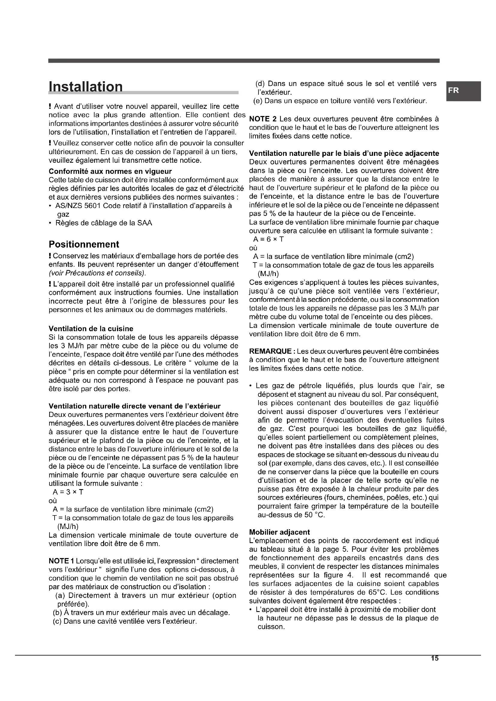 - Règles de câblage de la SAA Positionnement ! Conservez les matériaux d’emballage hors de portée des enfants. Ils peuvent représenter un danger d’étouffement (voir Précautions et conseils). ! L’appareil doit être installé par un professionnel qualié conformément aux instructions fournies. Une installation incorrecte peut être à l’origine de blessures pour les personnes et les animaux ou de dommages matériels. Ventilation de la cuisine Si la consommation totale de tous les appareils dépasse les 3 MJ/h par mètre cube de la pièce ou du volume de l’enceinte, l’espace doit être ventilé par l’une des méthodes décrites en détails ci-dessous. Le critère “ volume de la pièce “ pris en compte pour déterminer si la ventilation est adéquate ou non correspond à l’espace ne pouvant pas être isolé par des portes. Ventilation naturelle directe venant de l’extérieur Deux ouvertures permanentes vers l’extérieur doivent être ménagées. Les ouvertures doivent être placées de manière à assurer que la distance entre le haut de l’ouverture supérieur et le plafond de la pièce ou de l’enceinte, et la distance entre le bas de l’ouverture inférieure et le sol de la pièce ou de l’enceinte ne dépassent pas 5 % de la hauteur de la pièce ou de l’enceinte. La surface de ventilation libre minimale fournie par chaque ouverture sera calculée en utilisant la formule suivante : A = 3 × T