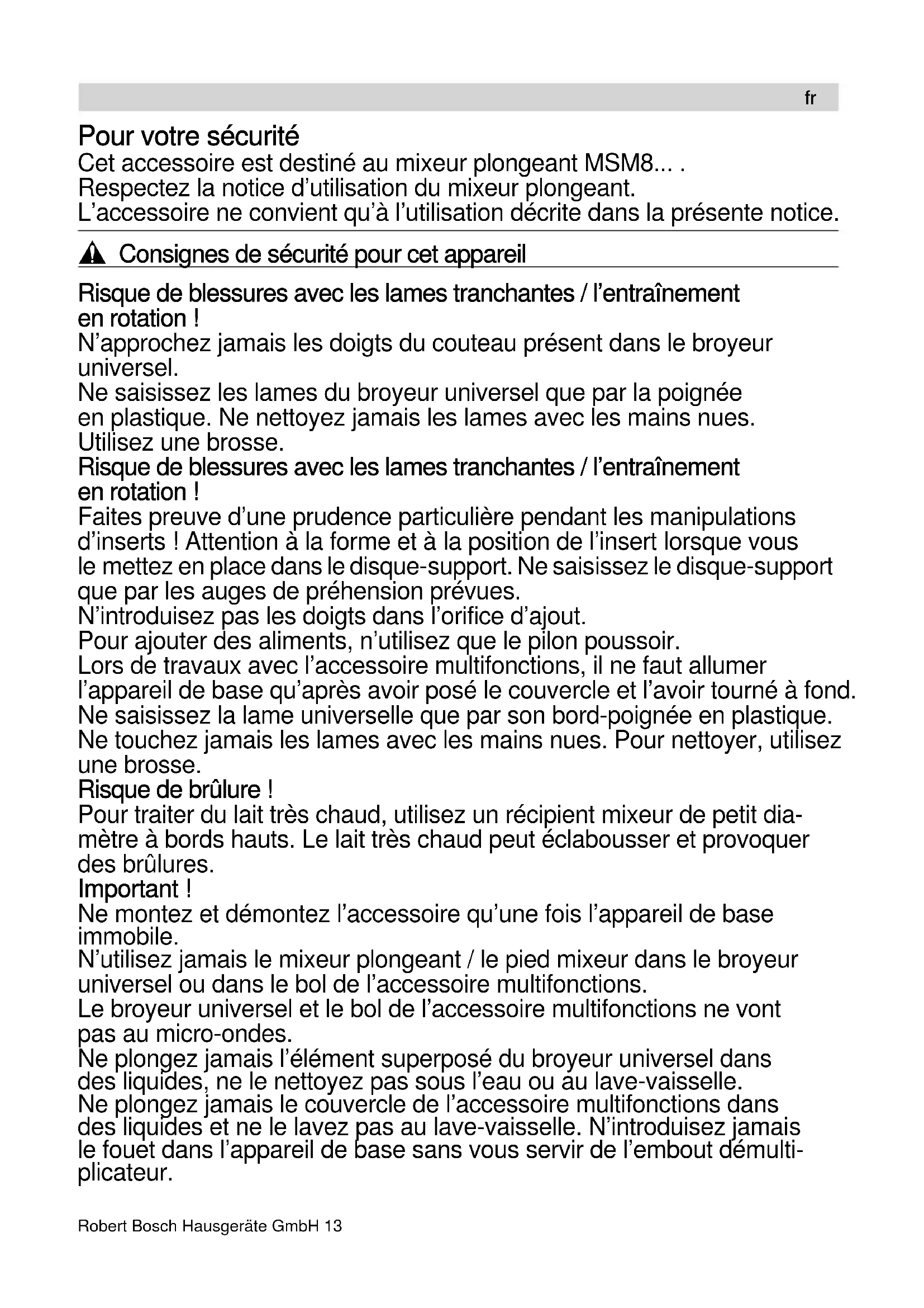 Subject to alterations.Robert Bosch Hausgeräte GmbH 13 Pour votre sécurité Cet accessoire est destiné au mixeur plongeant MSM8... . Respectez la notice d’utilisation du mixeur plongeant. L’accessoire ne convient qu’à l’utilisation décrite dans la présente notice.