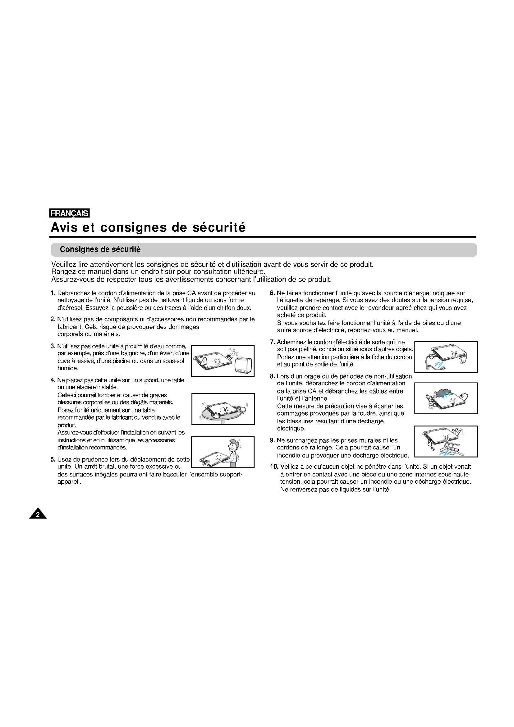 à entrer en contact avec une pièce ou une zone internes sous haute tension, cela pourrait causer un incendie ou une décharge électrique. Ne renversez pas de liquides sur l’unité. Consignes de sécurité Veuillez lire attentivement les consignes de sécurité et d’utilisation avant de vous servir de ce produit. Rangez ce manuel dans un endroit sûr pour consultation ultérieure. Assurez-vous de respecter tous les avertissements concernant l’utilisation de ce produit.3 FRANÇAIS Avis et consignes de sécurité