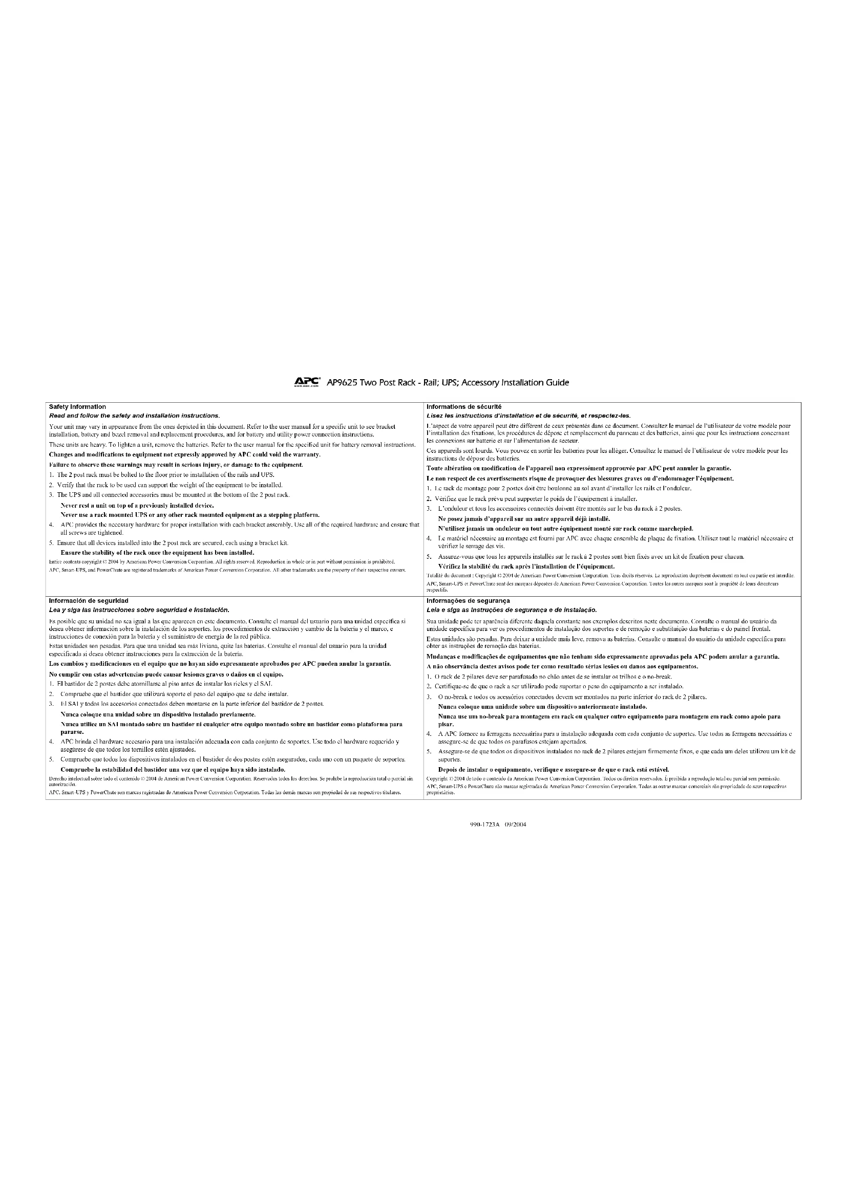 Ensure the stability of the rack once the equipment has been installed. Entire contents copyright © 2004 by American Power Conversion Corporation. All rights reserved. Reproduction in whole or in part without permission is prohibited. APC, Smart-UPS, and PowerChute are registered trademarks of American Power Conversion Corporation. All other trademarks are the property of their respective owners. Informations de sécurité Lisez les instructions d’installation et de sécurité, et respectez-les. L’aspect de votre appareil peut être différent de ceux présentés dans ce document. Consultez le manuel de l’utilisateur de votre modèle pour l’installation des fixations, les procédures de dépose et remplacement du panneau et des batteries, ainsi que pour les instructions concernant les connexions sur batterie et sur l’alimentation de secteur. Ces appareils sont lourds. Vous pouvez en sortir les batteries pour les alléger. Consultez le manuel de l’utilisateur de votre modèle pour les instructions de dépose des batteries. Toute altération ou modification de l’appareil non expressément approuvée par APC peut annuler la garantie. Le non respect de ces avertissements risque de provoquer des blessures graves ou d’endommager l’équipement.