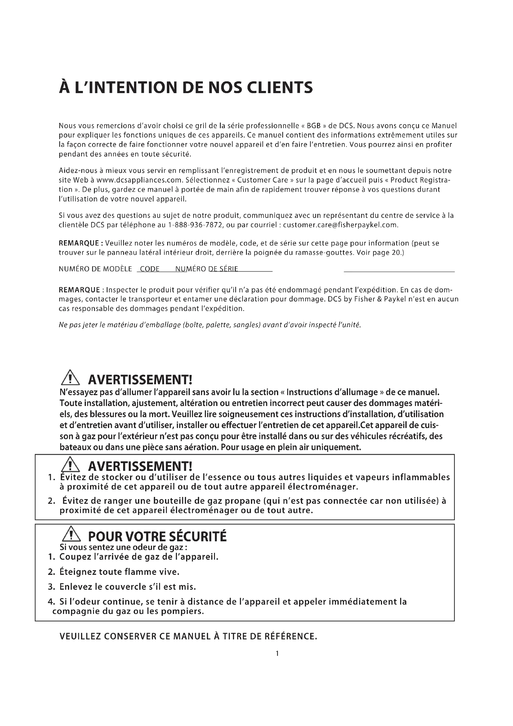 Si l’odeur continue, se tenir à distance de l’appareil et appeler immédiatement la compagnie du gaz ou les pompiers. VEUILLEZ CONSERVER CE MANUEL À TITRE DE RÉFÉRENCE.
