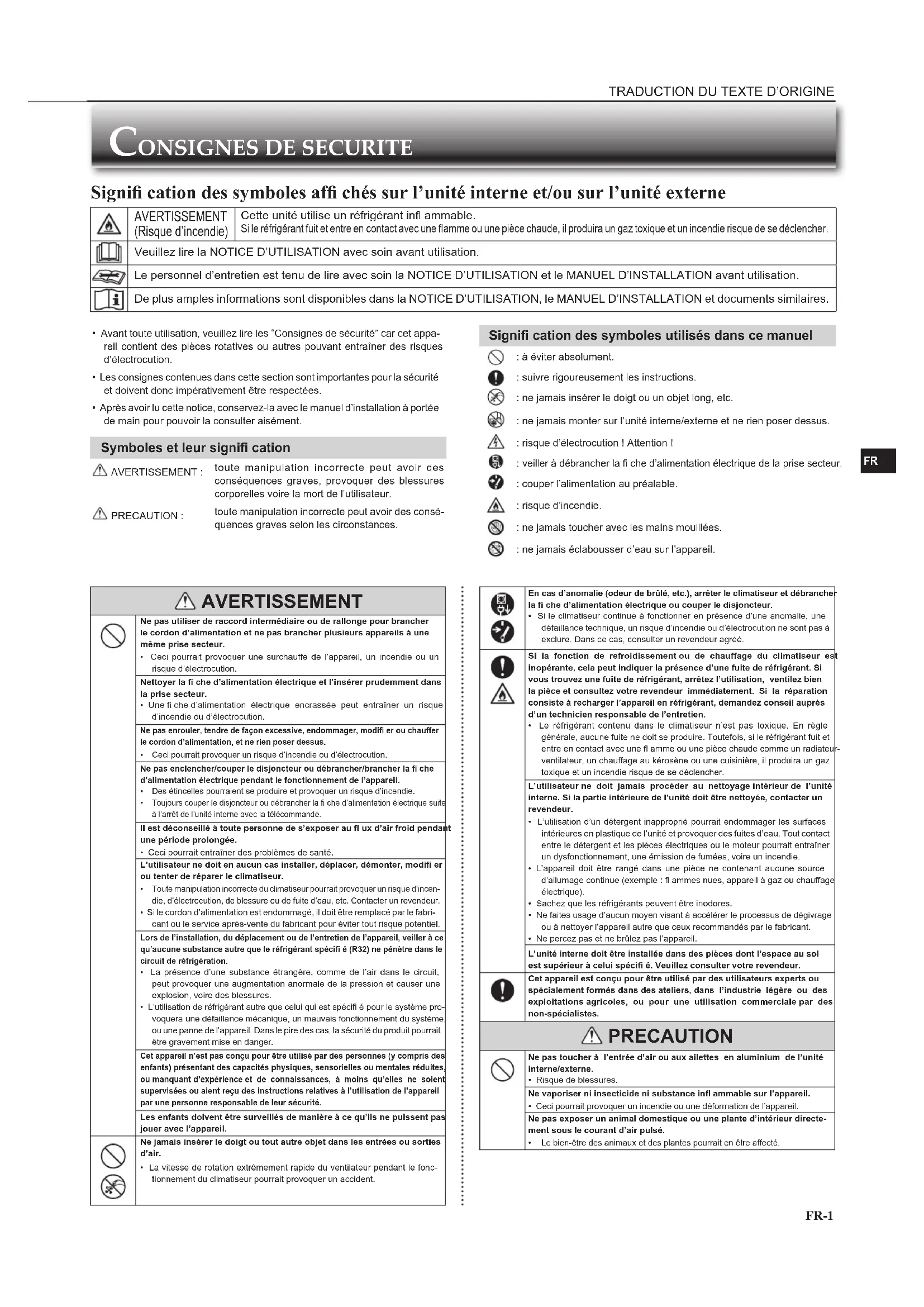 - Avant toute utilisation, veuillez lire les “Consignes de sécurité” car cet appa-reil contient des pièces rotatives ou autres pouvant entraîner des risques d’électrocution.• Les consignes contenues dans cette section sont importantes pour la sécurité et doivent donc impérativement être respectées.• Après avoir lu cette notice, conservez-la avec le manuel d’installation à portée de main pour pouvoir la consulter aisément. Symboles et leur signifi cation AVERTISSEMENT :toute manipulation incorrecte peut avoir des conséquences graves, provoquer des blessures corporelles voire la mort de l’utilisateur. PRECAUTION :toute manipulation incorrecte peut avoir des consé-quences graves selon les circonstances. AVERTISSEMENT Ne pas utiliser de raccord intermédiaire ou de rallonge pour brancher le cordon d’alimentation et ne pas brancher plusieurs appareils à une même prise secteur.• Ceci pourrait provoquer une surchauffe de l’appareil, un incendie ou un risque d’électrocution.Nettoyer la fi che d’alimentation électrique et l’insérer prudemment dans la prise secteur.• Une fi che d’alimentation électrique encrassée peut entraîner un risque d’incendie ou d’électrocution.Ne pas enrouler, tendre de façon excessive, endommager, modifi er ou chauffer le cordon d’alimentation, et ne rien poser dessus. Ceci pourrait provoquer un risque d’incendie ou d’électrocution.Ne pas enclencher/couper le disjoncteur ou débrancher/brancher la fi che d’alimentation électrique pendant le fonctionnement de l’appareil. Des étincelles pourraient se produire et provoquer un risque d’incendie. Toujours couper le disjoncteur ou débrancher la fi che d’alimentation électrique suite à l’arrêt de l’unité interne avec la télécommande. Il est déconseillé à toute personne de s’exposer au fl ux d’air froid pendant une période prolongée.• Ceci pourrait entraîner des problèmes de santé.L’utilisateur ne doit en aucun cas installer, déplacer, démonter, modifi er ou tenter de réparer le climatiseur. Toute manipulation incorrecte du climatiseur pourrait provoquer un risque d’incen-die, d’électrocution, de blessure ou de fuite d’eau, etc. Contacter un revendeur.• Si le cordon d’alimentation est endommagé, il doit être remplacé par le fabri-cant ou le service après-vente du fabricant pour éviter tout risque potentiel.Lors de l’installation, du déplacement ou de l’entretien de l’appareil, veiller à ce qu’aucune substance autre que le réfrigérant spécifi é (R32) ne pénètre dans le circuit de réfrigération.• La présence d’une substance étrangère, comme de l’air dans le circuit, peut provoquer une augmentation anormale de la pression et causer une explosion, voire des blessures. • L’utilisation de réfrigérant autre que celui qui est spécifi é pour le système pro-voquera une défaillance mécanique, un mauvais fonctionnement du système, ou une panne de l’appareil. Dans le pire des cas, la sécurité du produit pourrait être gravement mise en danger.Cet appareil n’est pas conçu pour être utilisé par des personnes (y compris des enfants) présentant des capacités physiques, sensorielles ou mentales réduites, ou manquant d’expérience et de connaissances, à moins qu’elles ne soient supervisées ou aient reçu des instructions relatives à l’utilisation de l’appareil par une personne responsable de leur sécurité.Les enfants doivent être surveillés de manière à ce qu’ils ne puissent pas jouer avec l’appareil. Ne jamais insérer le doigt ou tout autre objet dans les entrées ou sorties d’air.• La vitesse de rotation extrêmement rapide du ventilateur pendant le fonc-tionnement du climatiseur pourrait provoquer un accident. En cas d’anomalie (odeur de brûlé, etc.), arrêter le climatiseur et débrancher la fi che d’alimentation électrique ou couper le disjoncteur.• Si le climatiseur continue à fonctionner en présence d’une anomalie, une défaillance technique, un risque d’incendie ou d’électrocution ne sont pas à exclure. Dans ce cas, consulter un revendeur agréé. Si la fonction de refroidissement ou de chauffage du climatiseur est inopérante, cela peut indiquer la présence d’une fuite de réfrigérant. Si vous trouvez une fuite de réfrigérant, arrêtez l’utilisation, ventilez bien la pièce et consultez votre revendeur immédiatement. Si la réparation consiste à recharger l’appareil en réfrigérant, demandez conseil auprès d’un technicien responsable de l’entretien.• Le réfrigérant contenu dans le climatiseur n’est pas toxique. En règle générale, aucune fuite ne doit se produire. Toutefois, si le réfrigérant fuit et entre en contact avec une fl amme ou une pièce chaude comme un radiateur-ventilateur, un chauffage au kérosène ou une cuisinière, il produira un gaz toxique et un incendie risque de se déclencher.L’utilisateur ne doit jamais procéder au nettoyage intérieur de l’unité interne. Si la partie intérieure de l’unité doit être nettoyée, contacter un revendeur.• L’utilisation d’un détergent inapproprié pourrait endommager les surfaces intérieures en plastique de l’unité et provoquer des fuites d’eau. Tout contact entre le détergent et les pièces électriques ou le moteur pourrait entraîner un dysfonctionnement, une émission de fumées, voire un incendie.• L’appareil doit être rangé dans une pièce ne contenant aucune source d’allumage continue (exemple : fl ammes nues, appareil à gaz ou chauffage électrique).• Sachez que les réfrigérants peuvent être inodores.• Ne faites usage d’aucun moyen visant à accélérer le processus de dégivrage ou à nettoyer l’appareil autre que ceux recommandés par le fabricant.• Ne percez pas et ne brûlez pas l’appareil.L’unité interne doit être installée dans des pièces dont l’espace au sol est supérieur à 