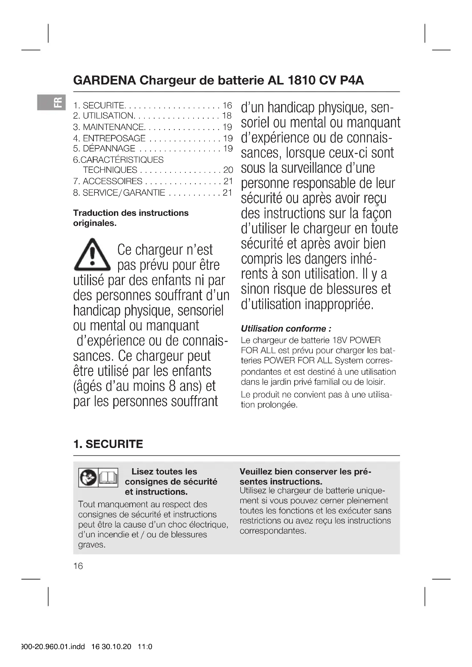 14900-20.960.01.indd 15 30.10.20 11:081. SECURITE Lisez toutes les consignes de sécurité et instructions. Tout manquement au respect des consignes de sécurité et instructions peut être la cause d’un choc électrique, d’un incendie et / ou de blessures graves. Veuillez bien conserver les pré- sentes instructions. Utilisez le chargeur de batterie unique- ment si vous pouvez cerner pleinement toutes les fonctions et les exécuter sans restrictions ou avez reçu les instructions correspondantes. GARDENA Chargeur de batterie AL 1810 CV P4A