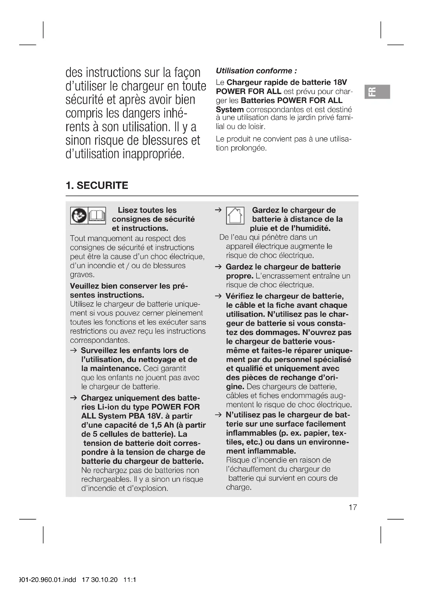 14901-20.960.01.indd 16 30.10.20 11:12des instructions sur la façon d’utiliser le chargeur en toute sécurité et après avoir bien compris les dangers inhé- rents à son utilisation. Il y a sinon risque de blessures et d’utilisation inappropriée. Utilisation conforme: Le Chargeur rapide de batterie 18V POWER FOR ALL est prévu pour char- ger les Batteries POWER FOR ALL System correspondantes et est destiné à une utilisation dans le jardin privé fami- lial ou de loisir. Le produit ne convient pas à une utilisa- tion prolongée.